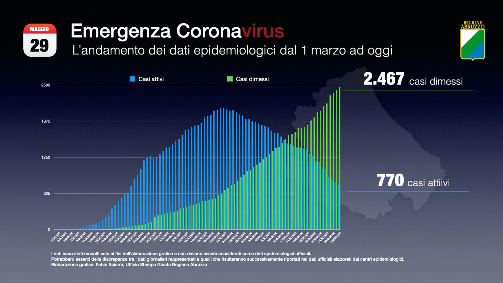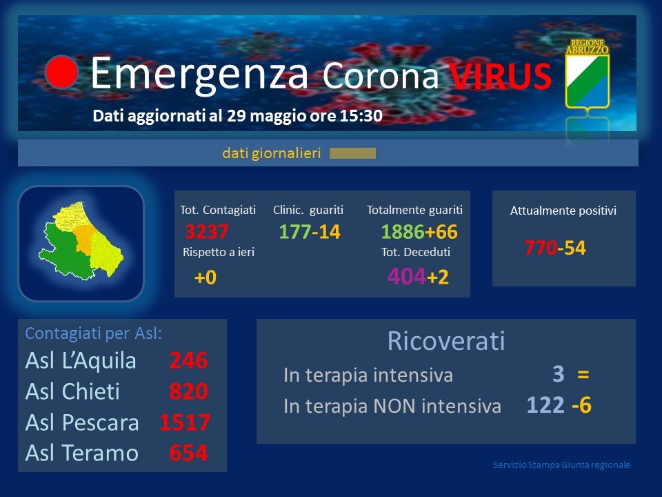 Il totale resta fermo a 3.237: 246 alla Asl dell’Aquila, 820 a Chieti, 1.517 alla Asl di Pescara e 654 a Teramo. Gli attualmente positivi sono 770 (-54). I guariti o dimessi sono 2.063 (+52).