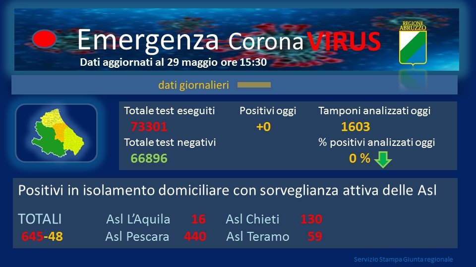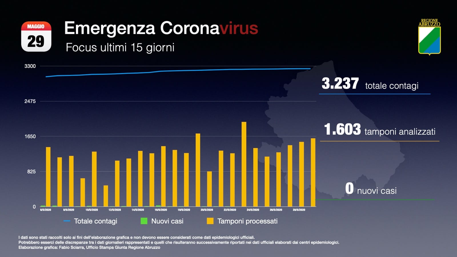 Per la prima volta dall’inizio dell’emergenza coronavirus l’Abruzzo azzera i contagi. Dai 1.603 test eseguiti nelle ultime ore, infatti, non sono emersi nuovi casi.