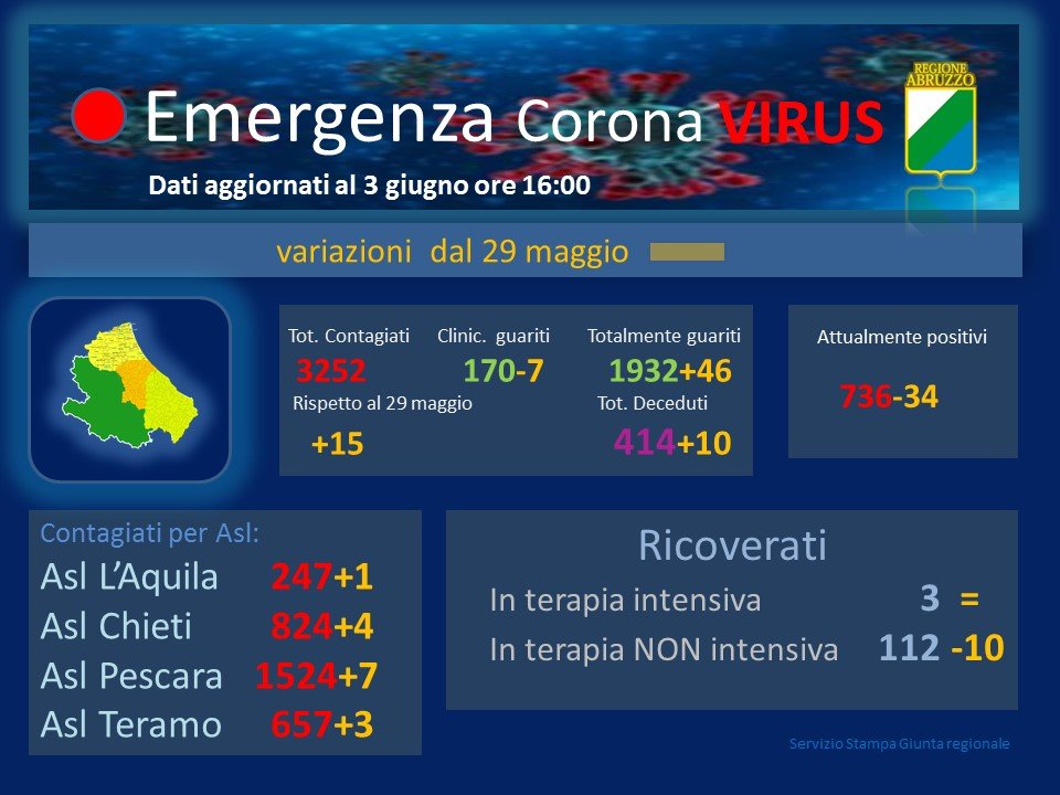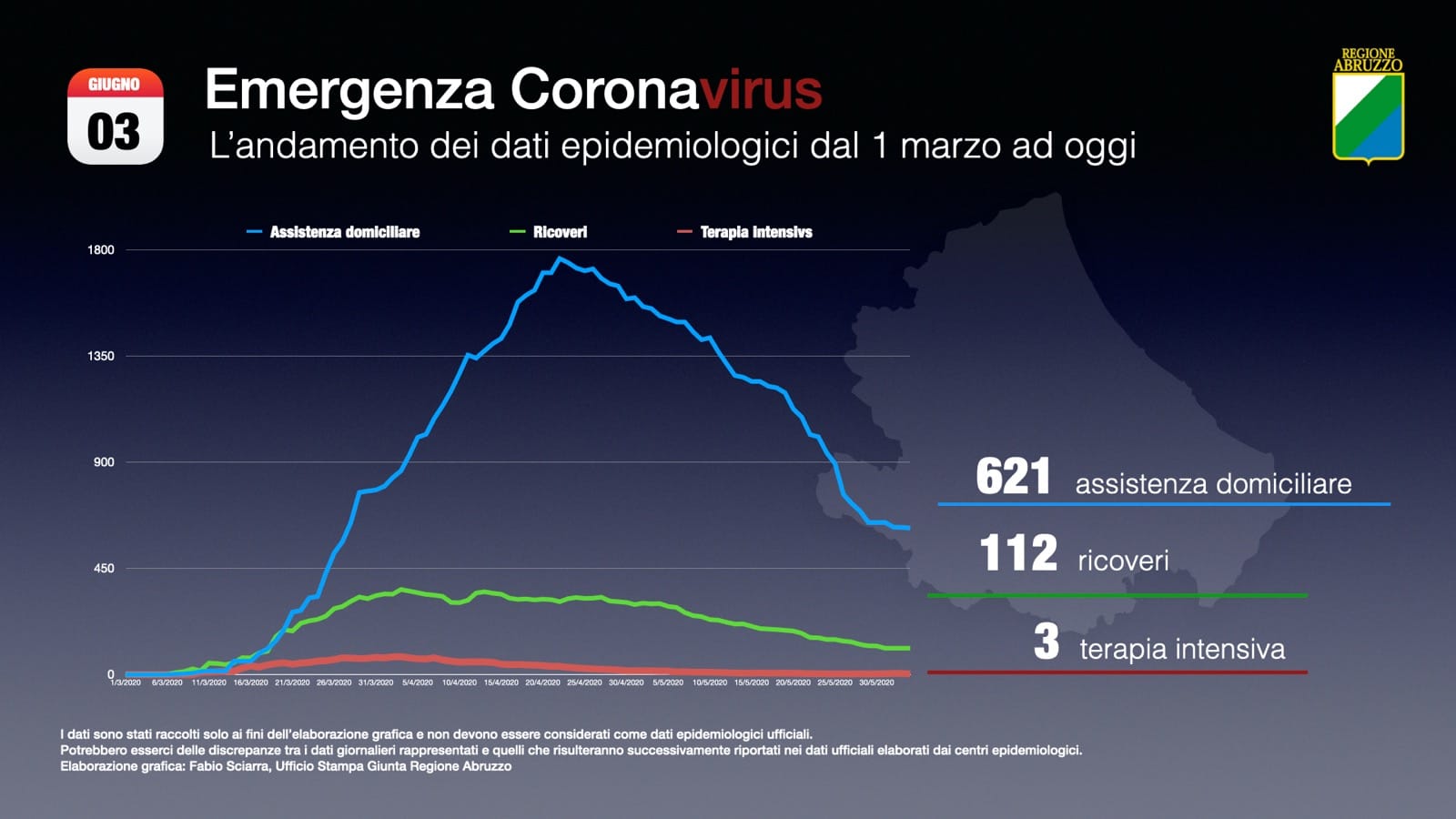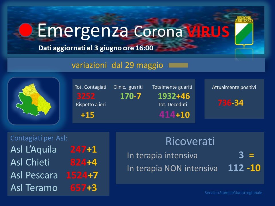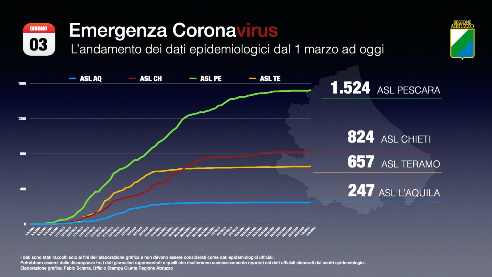 In Abruzzo, dall’inizio dell’emergenza, sono stati registrati 3252 casi positivi al Covid 19, diagnosticati dai test eseguiti nel laboratorio di riferimento regionale di Pescara, dall’Istituto Zooprofilattico di Teramo, dall’Università di Chieti e dal laboratorio dell’ospedale dell’Aquila.