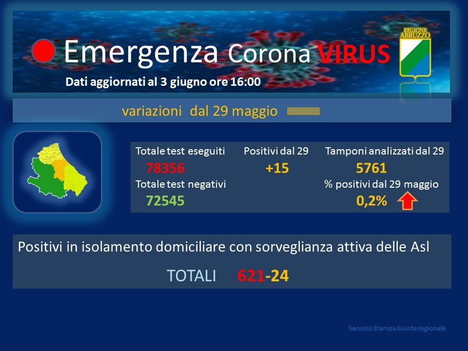 Rispetto a ieri si registra un aumento di 3 nuovi casi.