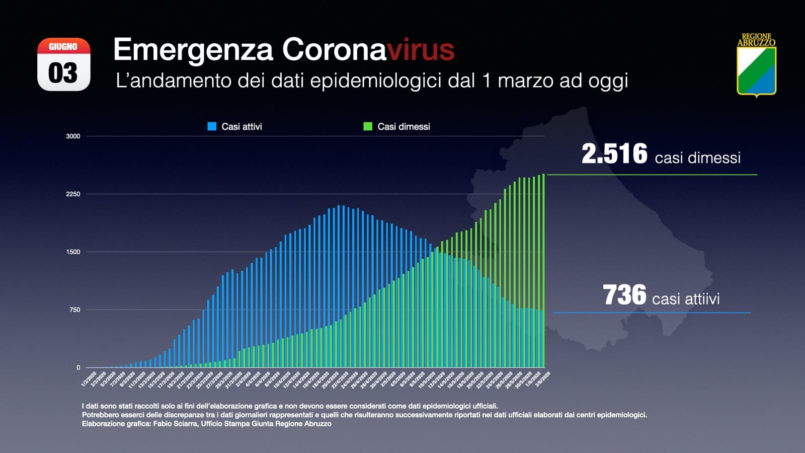 Gli attualmente positivi in Abruzzo (calcolati sottraendo al totale dei positivi, il numero dei dimessi/guariti e dei deceduti) sono 736, con una diminuzione di 34 unità rispetto a venerdì.