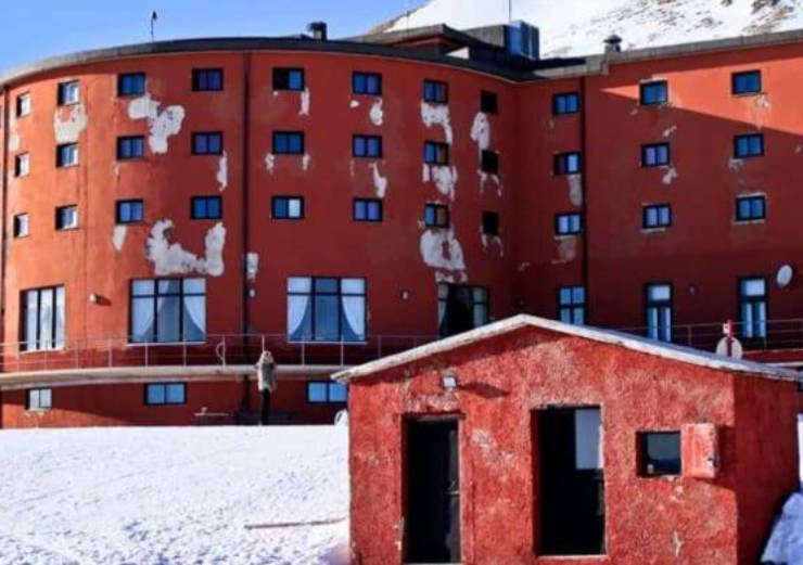 L’Hotel Campo Imperatore, sulle pendici del Monte Portella, a quota 2130 metri, è la storica struttura che per quasi 80 anni ha ospitato nei suoi lussuosi saloni vacanzieri e turisti che arrivavano da ogni parte d’Italia e non solo per godersi uno spettacolo mozzafiato. A cavallo del nuovo millennio l’Hotel è andato piano piano in decadenza fino al 2016 quando l’ultima gestione decise che lo storico albergo chiudeva definitamente i battenti. Da quel momento, a chiunque saliva con la funivia fino a lassù restava l’immagine di quell’imponente struttura particolare nella forma e nel colore rosso dei suoi mattoni esterni che risaltavano soprattutto con il manto candido della neve d’inverno.