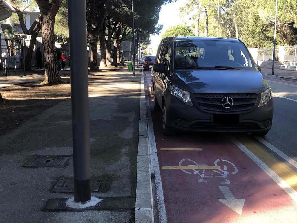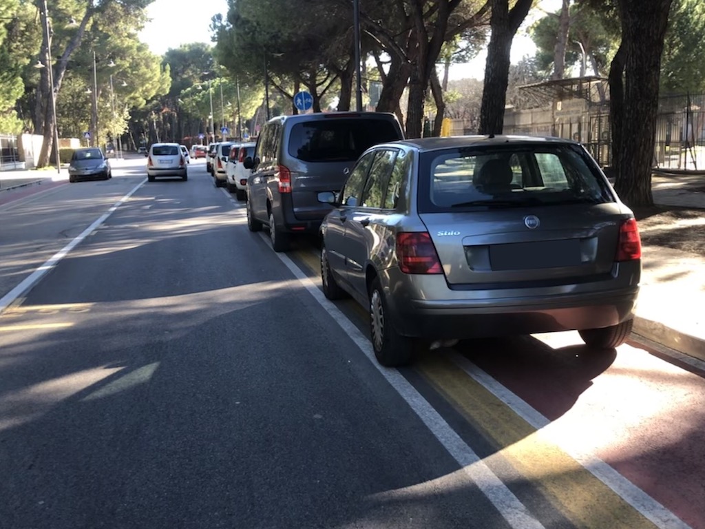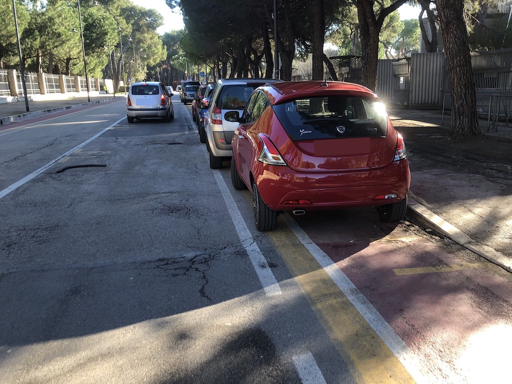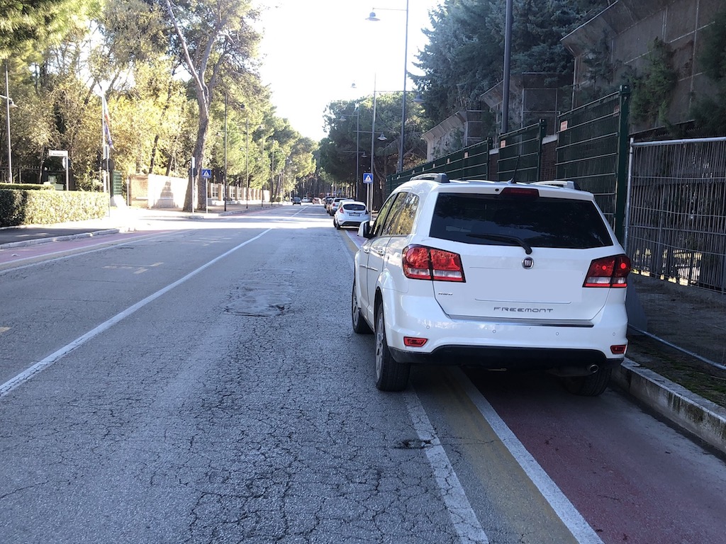 Pescara. L’associazione Fiab PescaraBici il “cronico ingombro” da parte delle automobili sulla pista ciclabile in zona stadio.