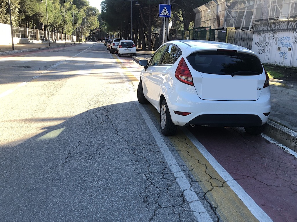 “Lungo via D’Avalos, nel tratto lato monte compreso tra Via Pepe e l’Aurum”, riferisce l’associazione, “è stata realizzata una curiosa pista ciclabile che in corrispondenza dello stadio un po’ sta sulla strada ma, non appena il marciapiede si fa un po’ più ampio, ci si infila; e dopo via Elettra ci rimane fin quasi fino all’altezza dell’Aurum. Una curiosa interpretazione della viabilità cicistica, che ci piacerebbe venisse spiegata dal progettista. Ma da quel che accade solitamente nei paraggi possiamo immaginarcene la ragione, che sta in una sola parola: parcheggi!”.