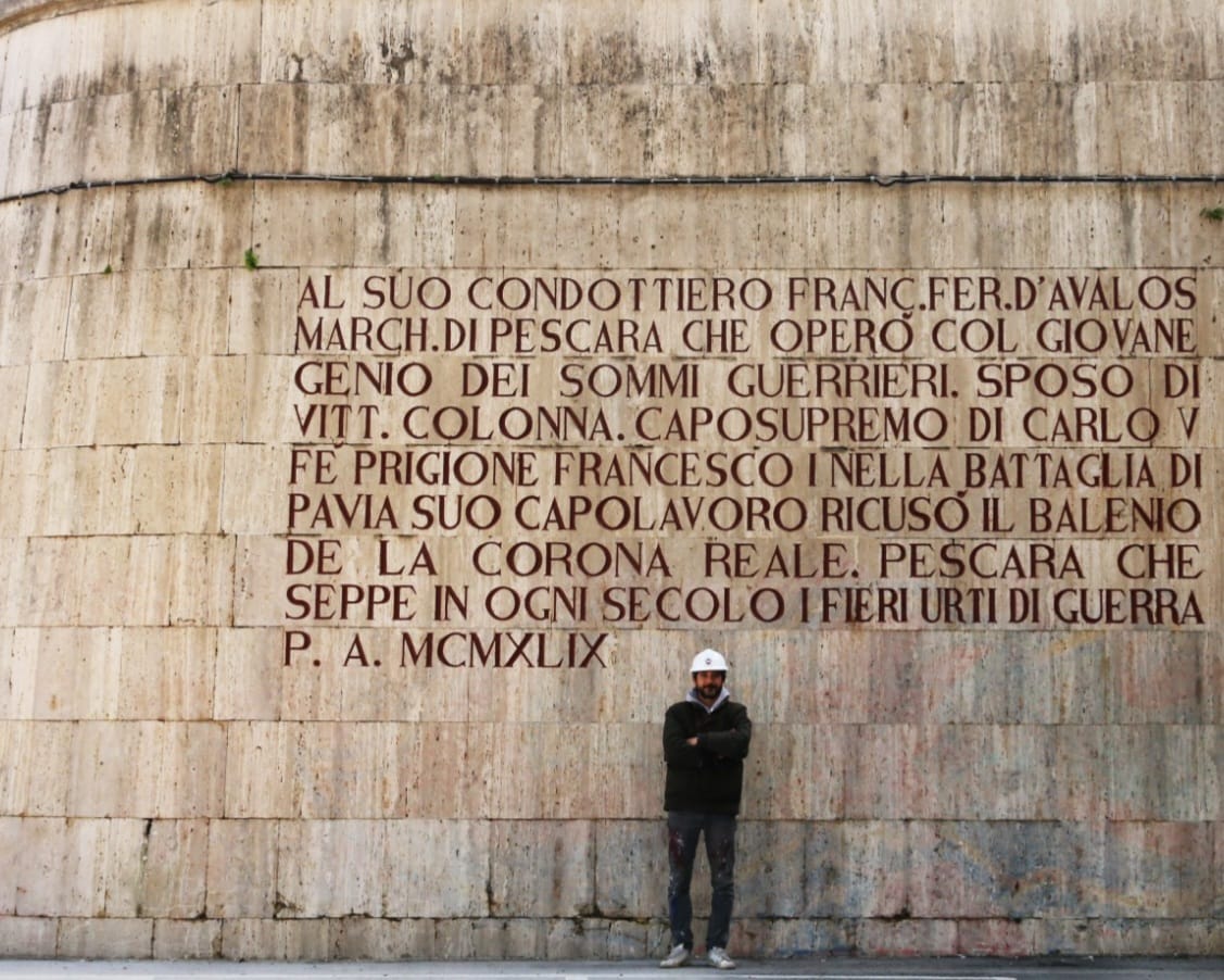Pescara. Riprendono colore le scritte sui Bastioni del Ponte Risorgimento che descrivono le origini di Pescara.