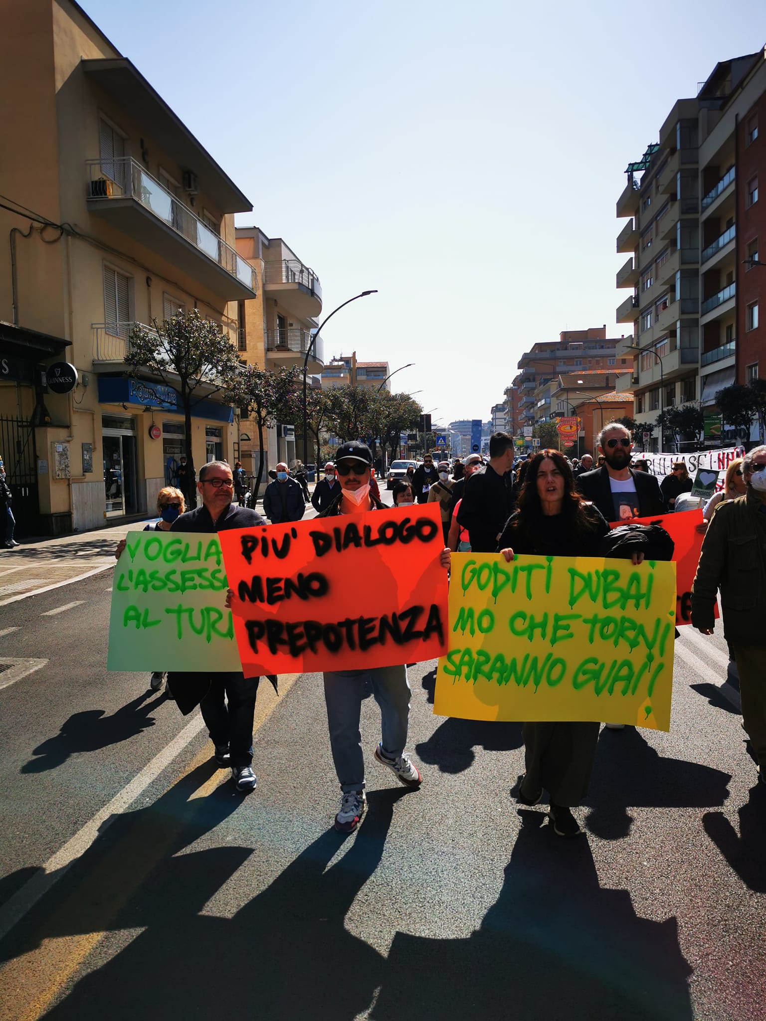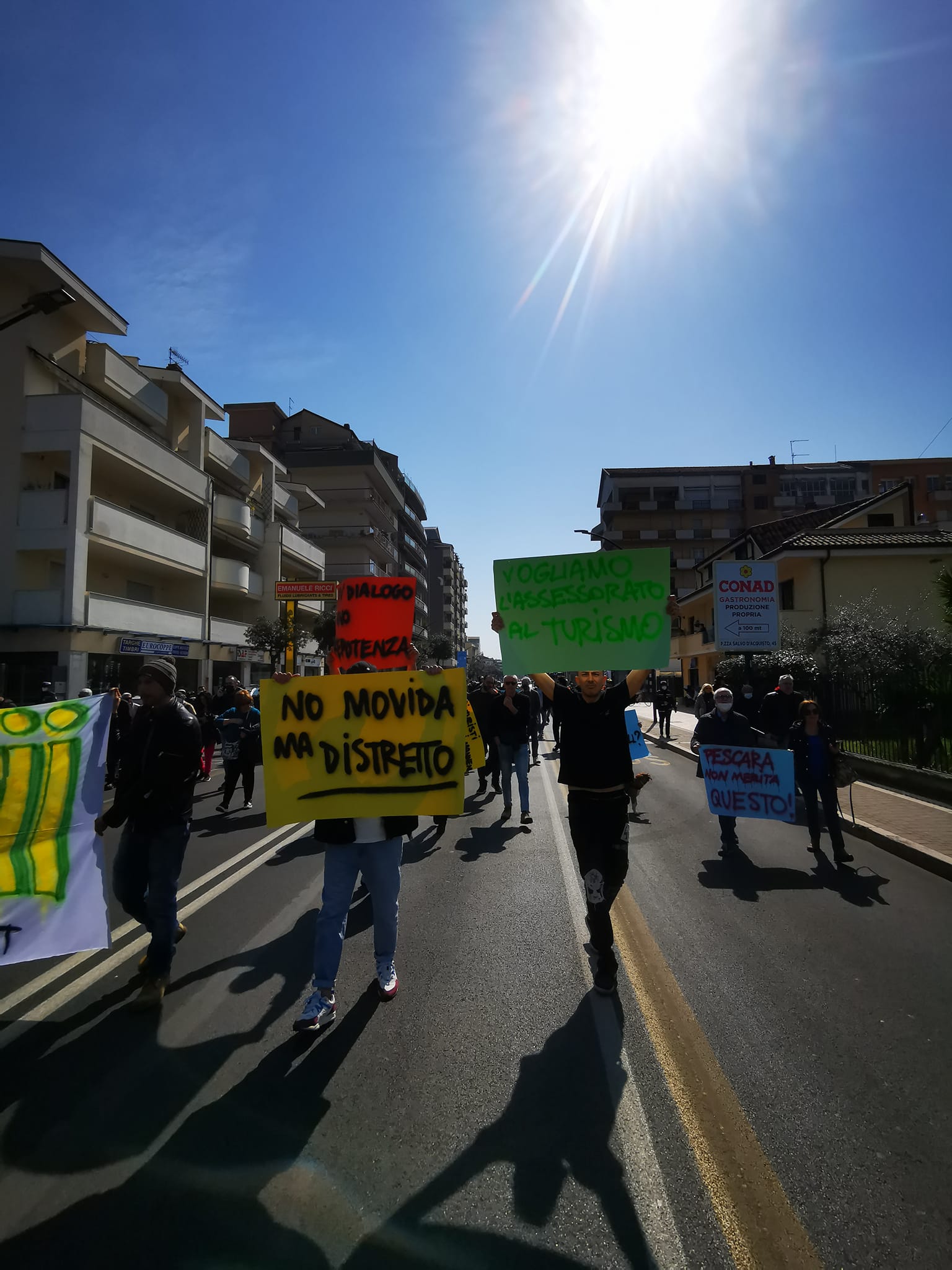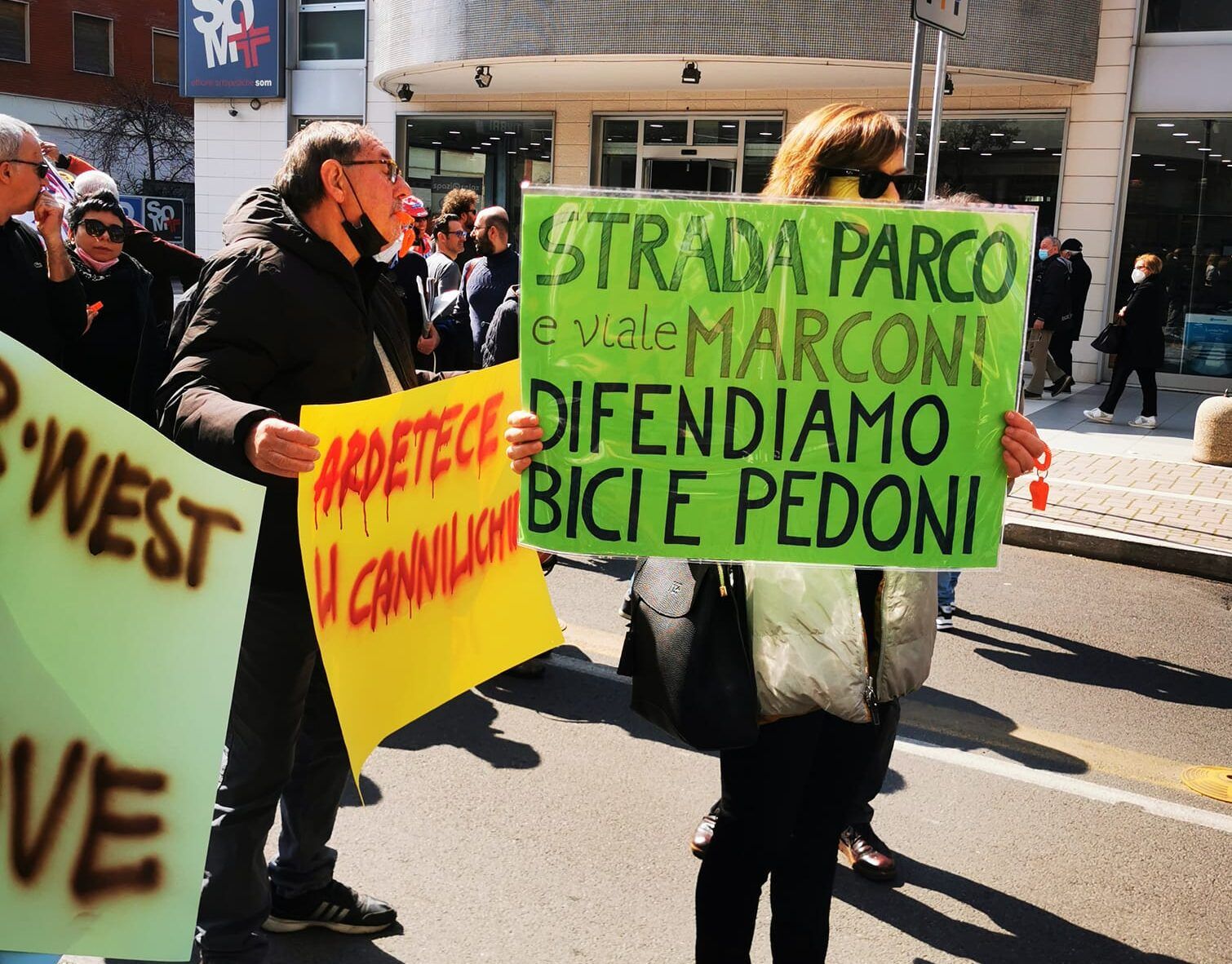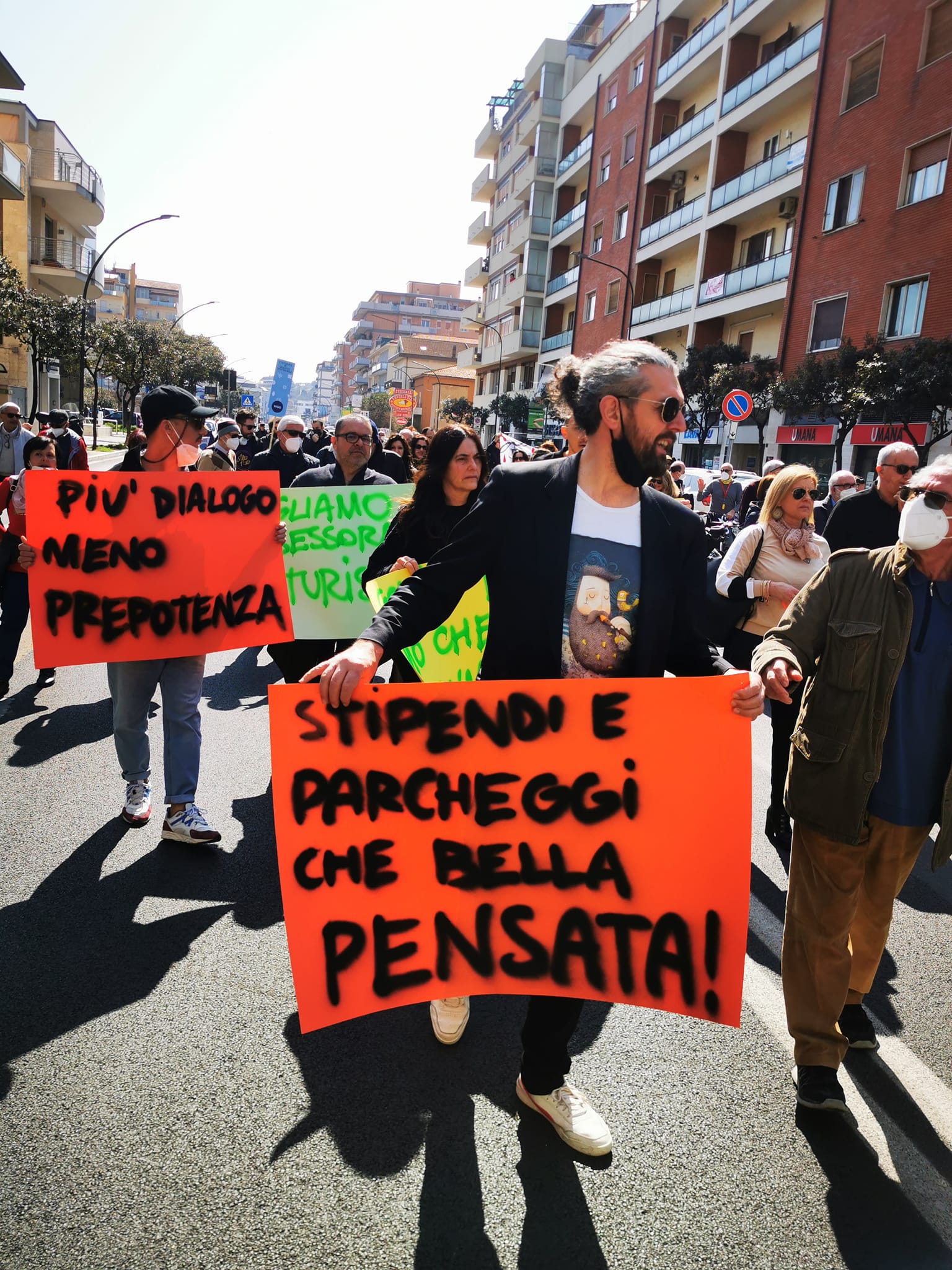 In centinaia sono scesi in strada, con striscioni e manifesti, dai chiari messaggi: inaccettabile, per chi la vive, la nuova viabilità di Viale Marconi e la cancellazione dei parcheggi a servizio dei negozi; inaccettabili le scelte del sindaco Masci e dell’assessore al Commercio Alfredo Cremonese per la riduzione sempre più stringente degli orari dei locali del quadrilatero del centro, a favore della pace dei residenti.