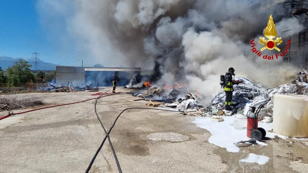 In fiamme del materiale plastico stoccato all’esterno della fabbrica Italcables, attualmente dismessa. Le fiamme sarebbero partite dall’esterno ed avrebbero poi raggiunto la struttura.