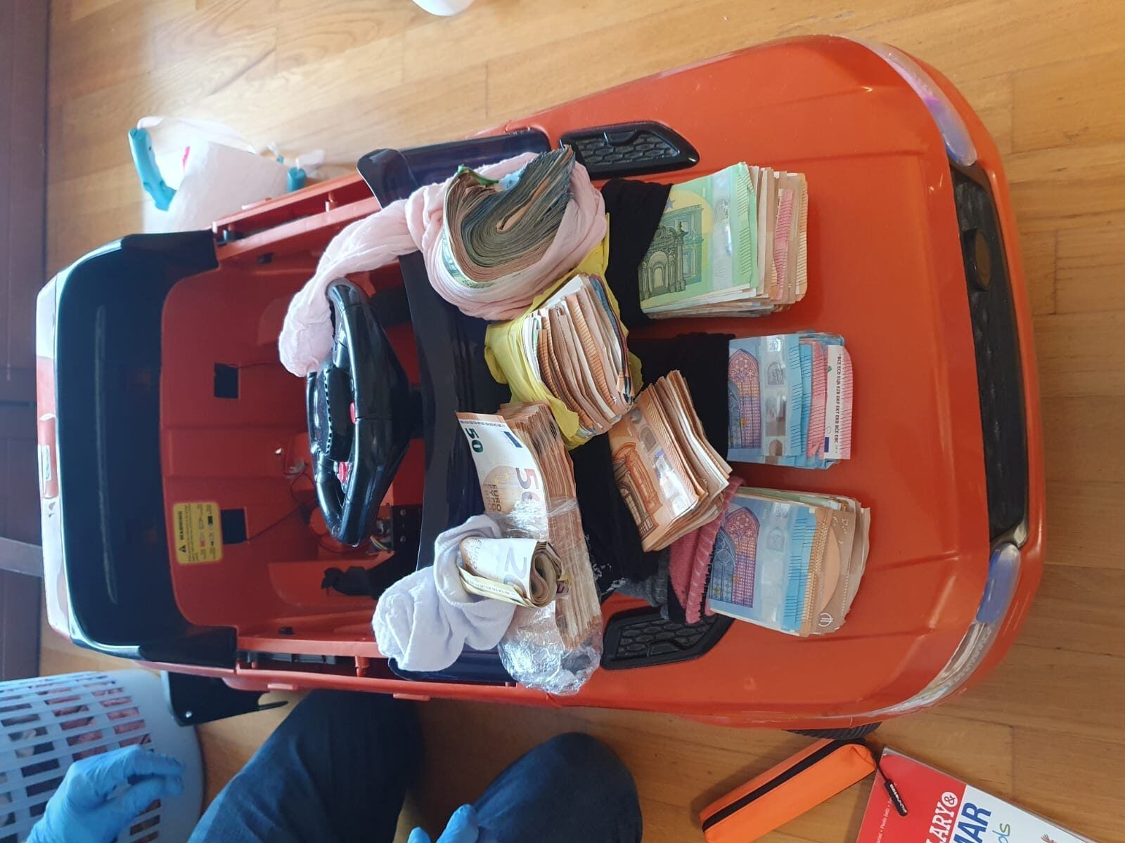 I contanti, gli orologi e i gioielli erano nascosti in calzini riposti all’ interno di giocattoli appartenenti ai figli della coppia di indagati. Sono in corso gli accertamenti per determinare la provenienza degli oggetti preziosi.