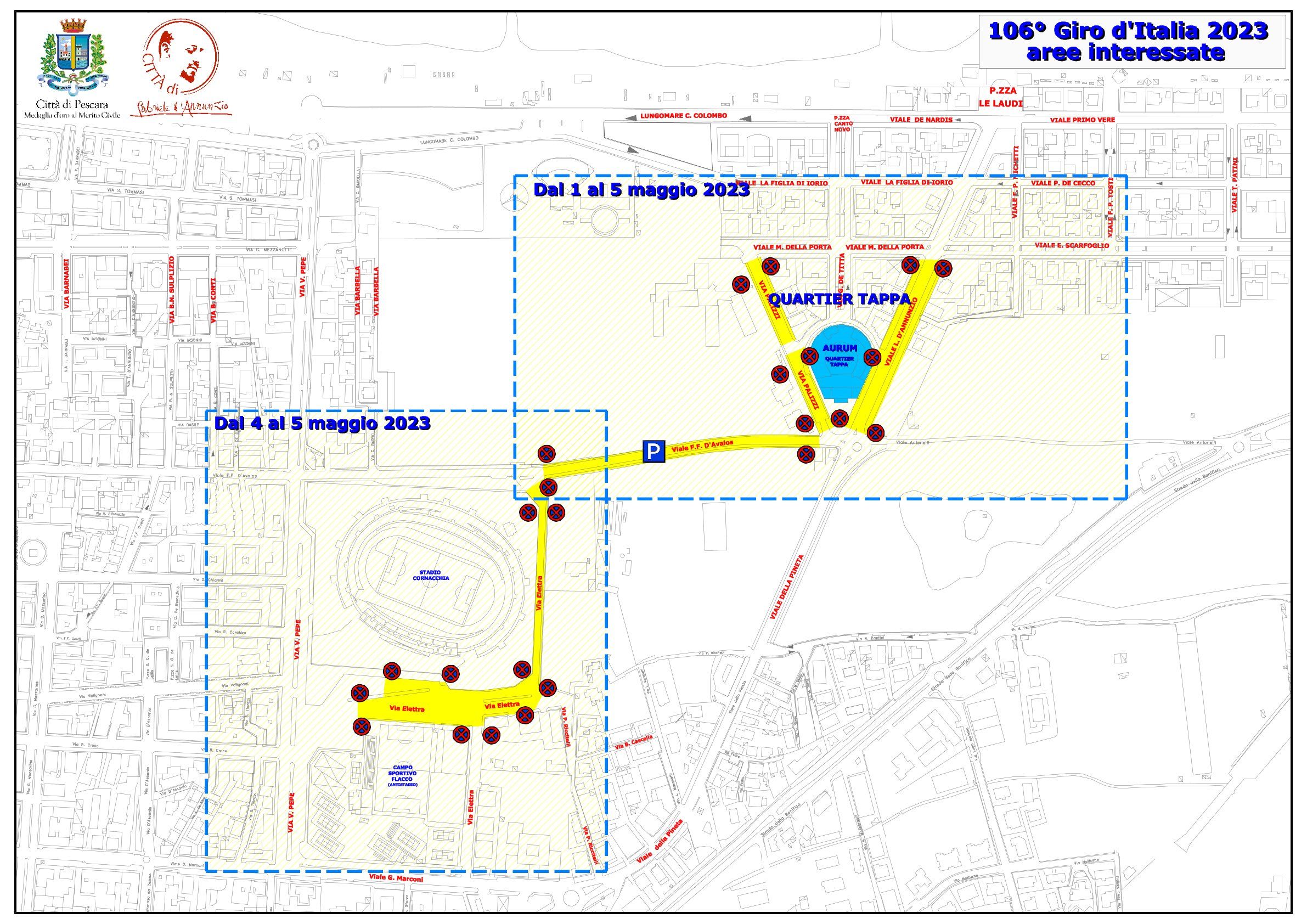 nel distretto dell’Aurum, che dal I al 5 maggio sarà sede operativa e quartier generale di tappa per Rcs, sarà interdetta la sosta in via Luisa D’Annunzio, Via Palizzi e in parte di Via D’Avalos, oltre che – ma in questo caso solo per le giornate del 4 e 5 maggio – nelle aree contigue e retrostanti la curva sud e la tribuna Maiella dello stadio Adriatico, che accoglieranno i mezzi al seguito del circo rosa;