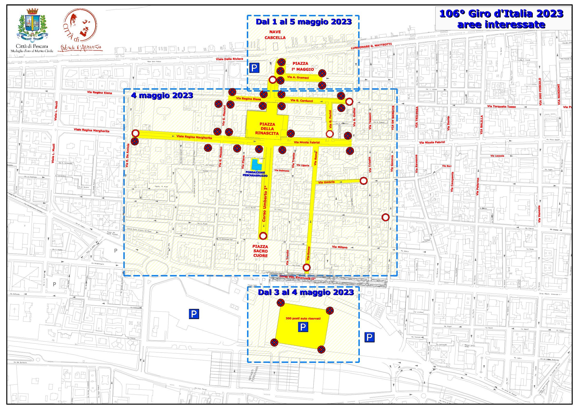 l’area di Piazza I Maggio lato sud, che dal I al 5 maggio sarà riservata ai mezzi mobili della Rai e alle unità di servizio al seguito della corsa, dove è stata determinata l’interdizione alla sosta di via Gramsci. Per la sola serata del 4 maggio, e quindi per la sola kermesse ufficiale nazionale di Piazza della Rinascita (con un contestuale evento di spettacolo), saranno interessate anche Viale Regina Margherita, il primo tratto di via Nicola Fabrizi, Via Parini, Via Carducci e Viale Regina Elena. Per gli addetti ai lavori (circa 2000 persone seguono il Giro), saranno riservati circa 300 posti di sosta sulle aree di risulta. A Pescara sono attese 70 televisioni da tutto il mondo, fotografi e giornalisti di numerose testate nazionali e internazionali.