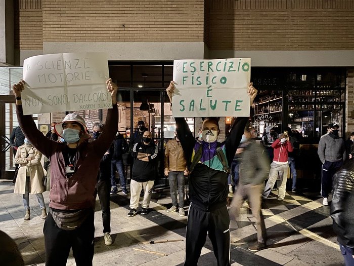 Imponente la presenza delle forze dell’ordine, con Polizia, Carabinieri e Polizia municipale. “Ci hanno fatto investire per il distanziamento e la sicurezza – hanno detto più volte i manifestanti – e nel giro di pochi giorni ci hanno fatto chiudere. Oggi possiamo andare a pranzo al ristorante, ma alle 18 deve chiudere tutto perché arriva improvvisamente il Covid”. In tanti hanno chiesto di vedere i dati sui contagi: “Dovrebbero dirci chi e dove si contagia: non certo nelle palestre, non certo nei ristoranti”, hanno sottolineato, tirando in ballo la questione trasporti pubblici.