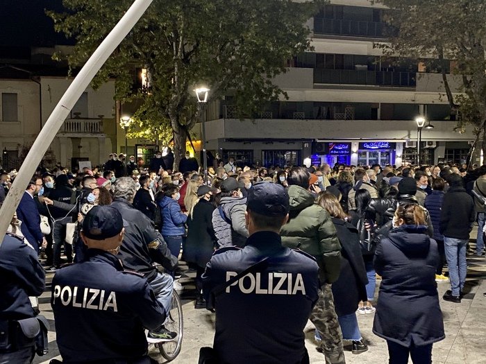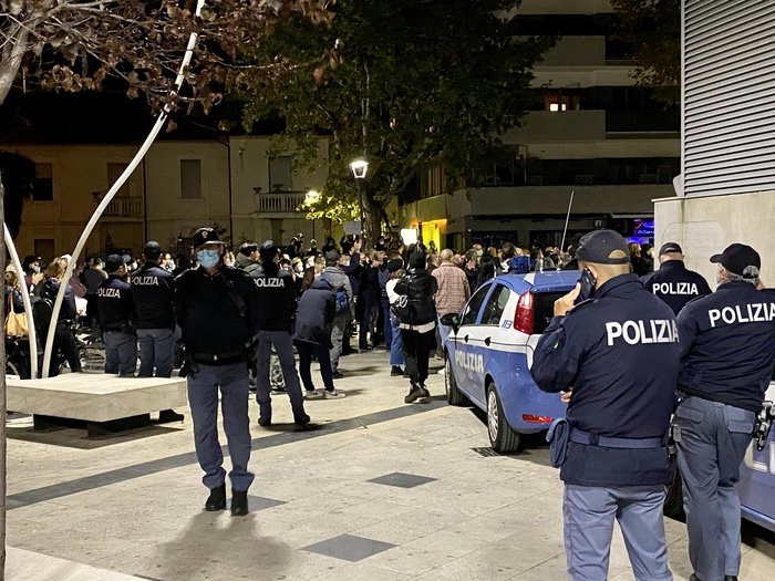 Tutto intorno, invece, il deserto: nelle vie centrali qualche minuto dopo le 18, ora in cui, come disposto dal nuovo dpcm, bar, pub, ristoranti e pizzerie hanno dovuto abbassare le saracinesche. Corso Umberto, il corso per eccellenza del capoluogo adriatico, in quella che nei giorni normali è l’ora di punta, si è presentata con molta meno gente in strada.