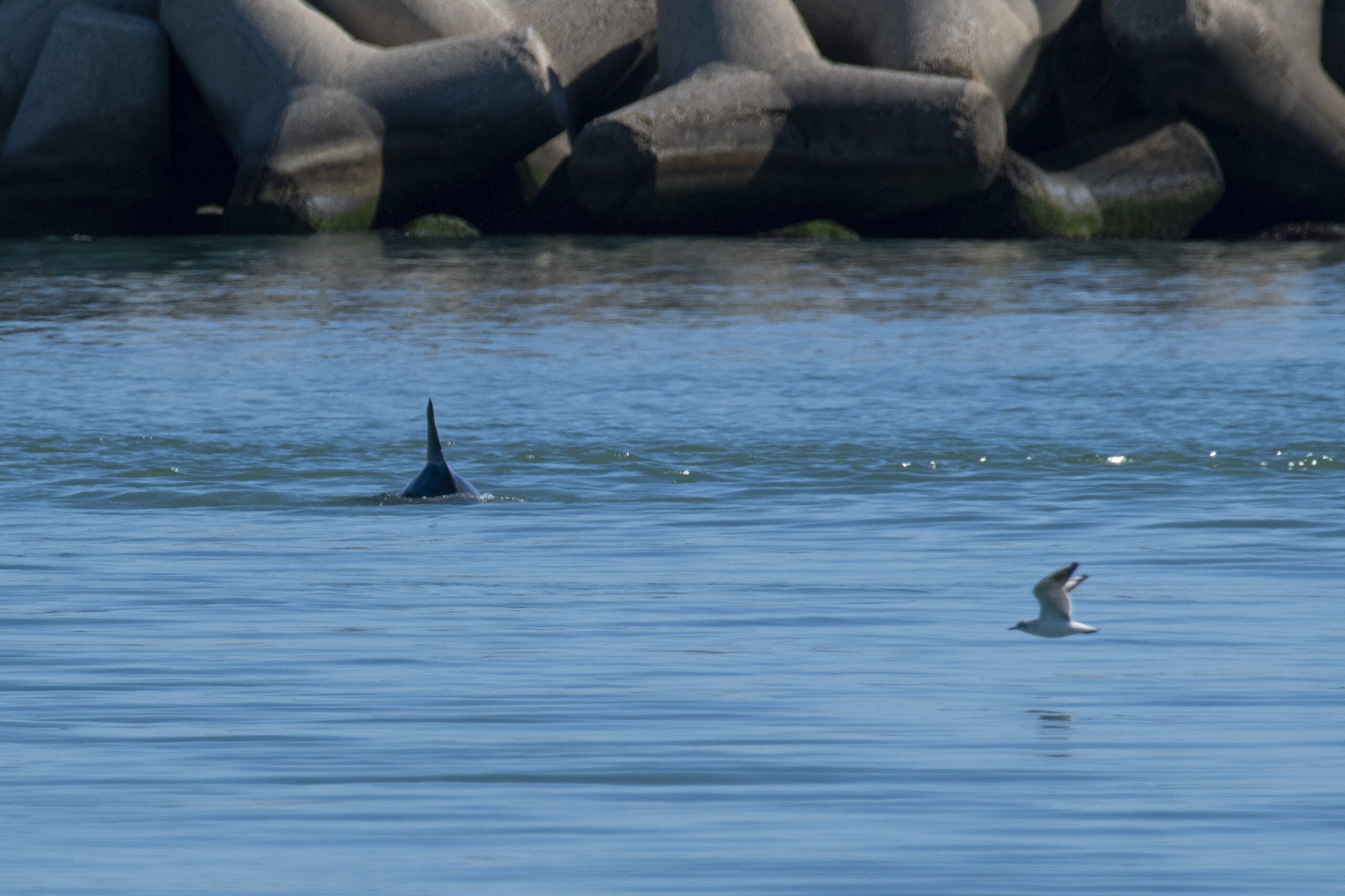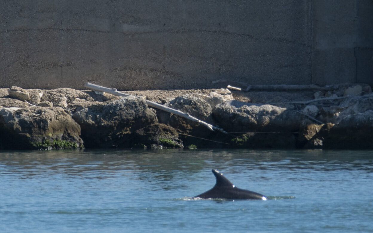 Pescara. Due delfini immortalati mentre nuotano all’ interno del porto di Pescara.