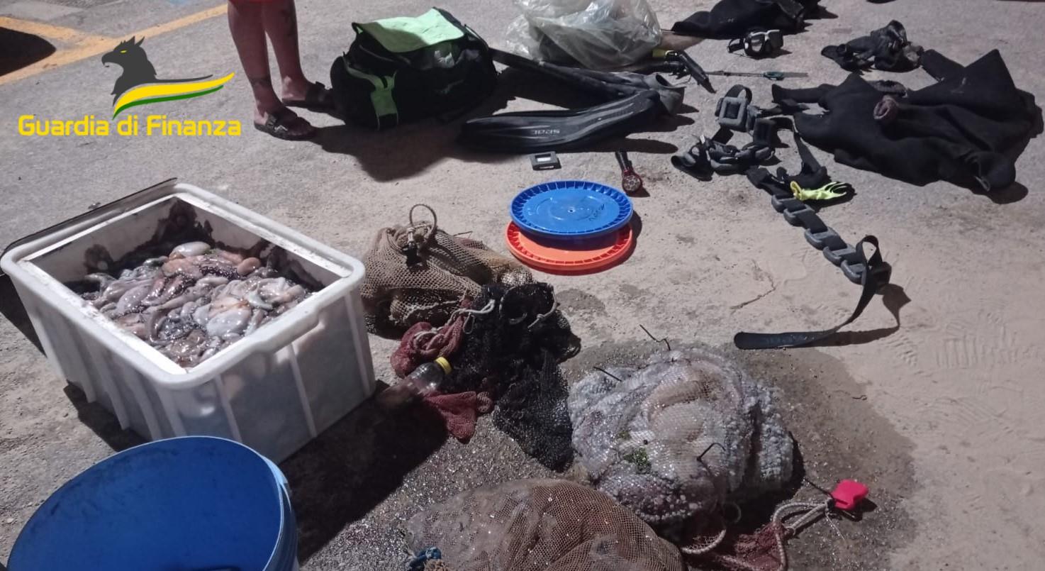 Dopo ore di immersioni trascorse a passare al setaccio quasi 4 chilometri di scogliera e con un bottino di oltre 100 chili di polipi, i pescatori di frodo sono riemersi trovandosi difronte i militari del Nucleo Sommozzatori della Stazione Navale di Pescara.