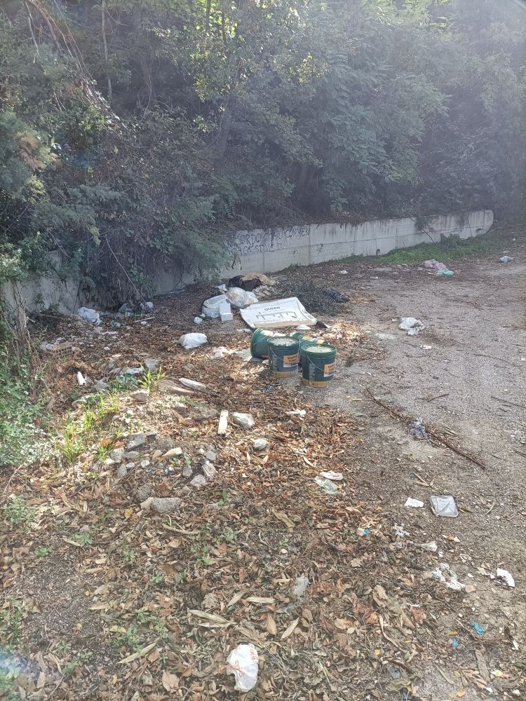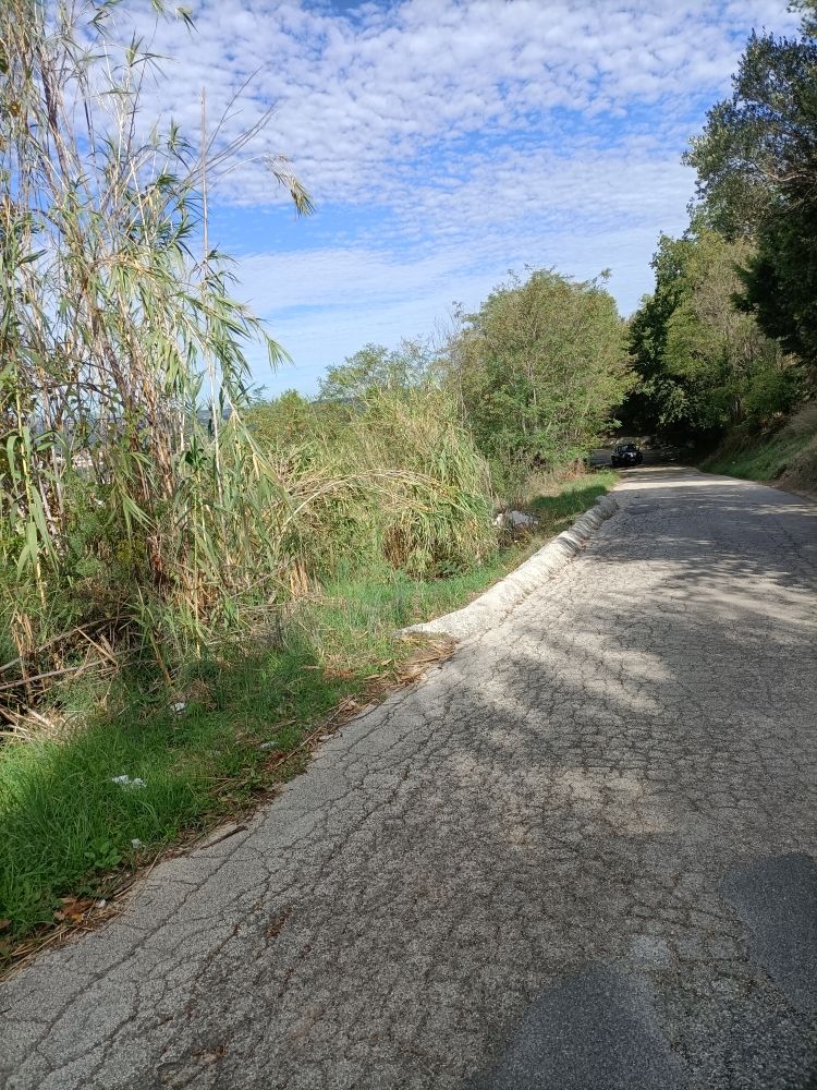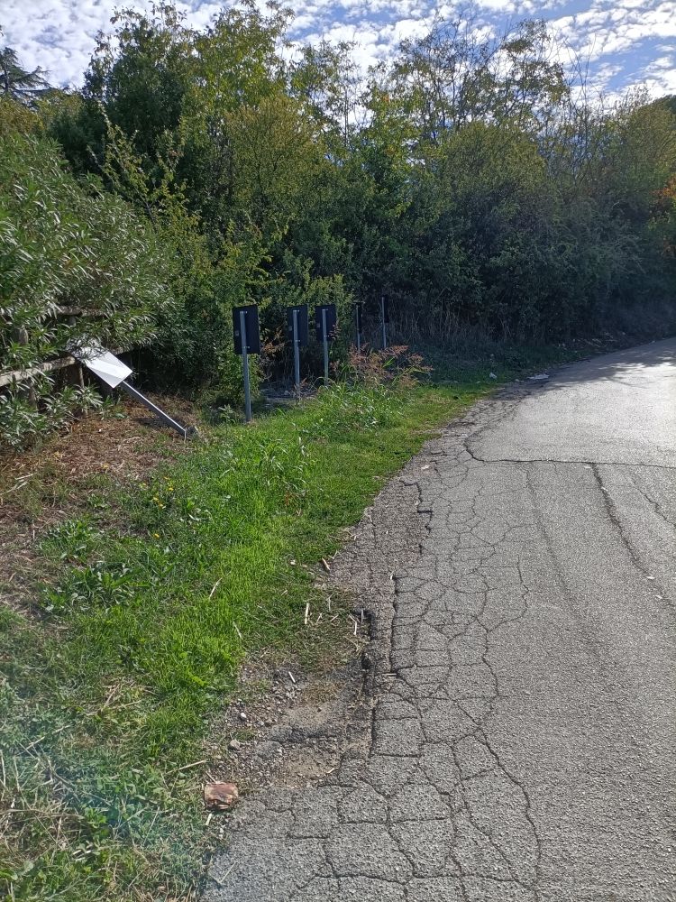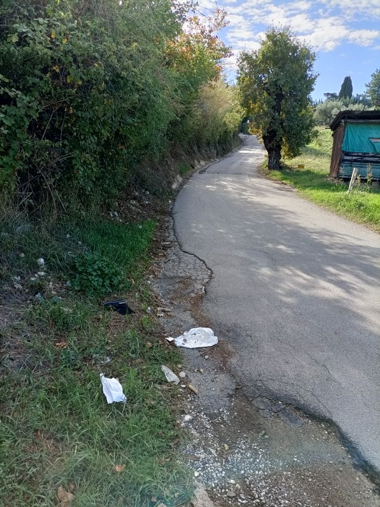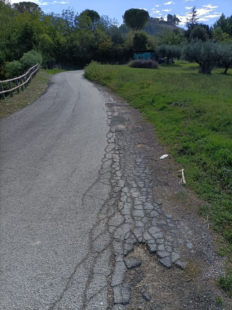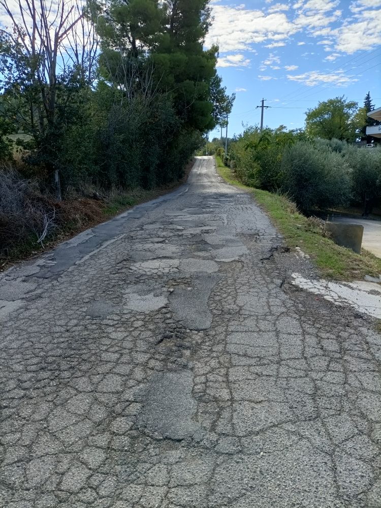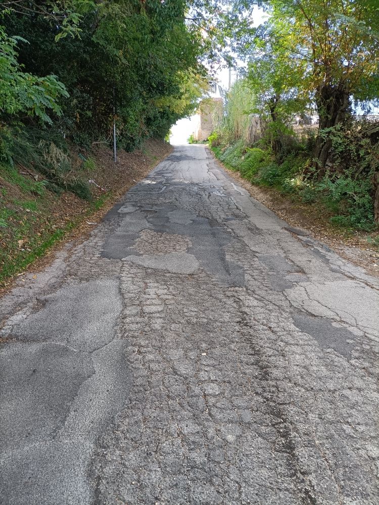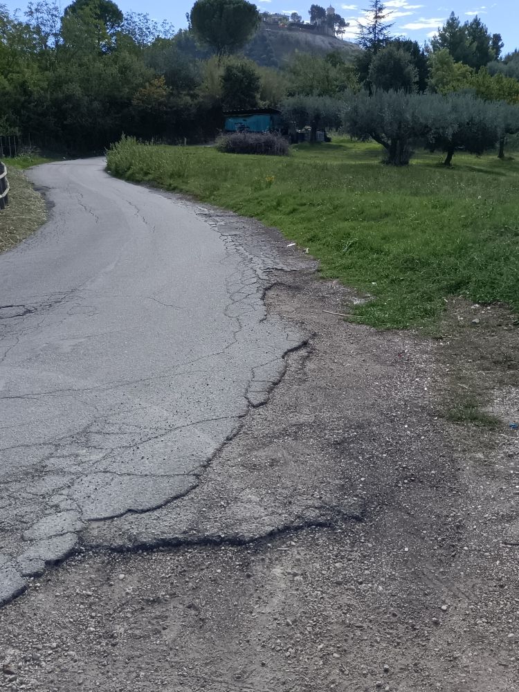 “Il manto stradale è pressoché in disfacimento con buche e cordoli di frana del colle mai sistemati, carreggiata stretta, dove si circola a doppio senso con il pericolo di trovarsi di fronte anche trattori nelle curve nascoste dalla vegetazione”, prosegue il residente, che aggiunge la presenza di “dossi che rendono il transito pericoloso e illuminazione mancante per buona parte della sua lunghezza (circa 3 km). Guardrail mancanti soprattutto in prossimità della mia palazzina dove sussiste ancora una staccionata in legno oramai completamente divelta su un livello stradale sopra un camminamento pedonale. Mancanza di grate di raccolta acqua che provocano d’inverno marea di fango e fiumi di acqua lungo tutta la discesa provocando zone impraticabili per pedoni a ridosso delle palazzine. Grosse querce le cui radici fuoriescono dal terreno direttamente sul manto stradale o di quel che sembra. Per non parlare della discarica a cielo aperto lungo la salita”.