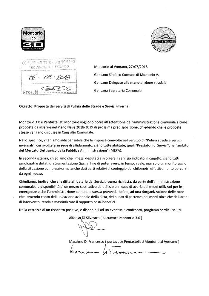 A mezzo di una richiesta ufficiale protocollata (foto), Montorio 3.0 e i Pentastellati, chiedono all’amministrazione comunale di Montorio al Vomano, una riorganizzazione del piano neve territoriale.