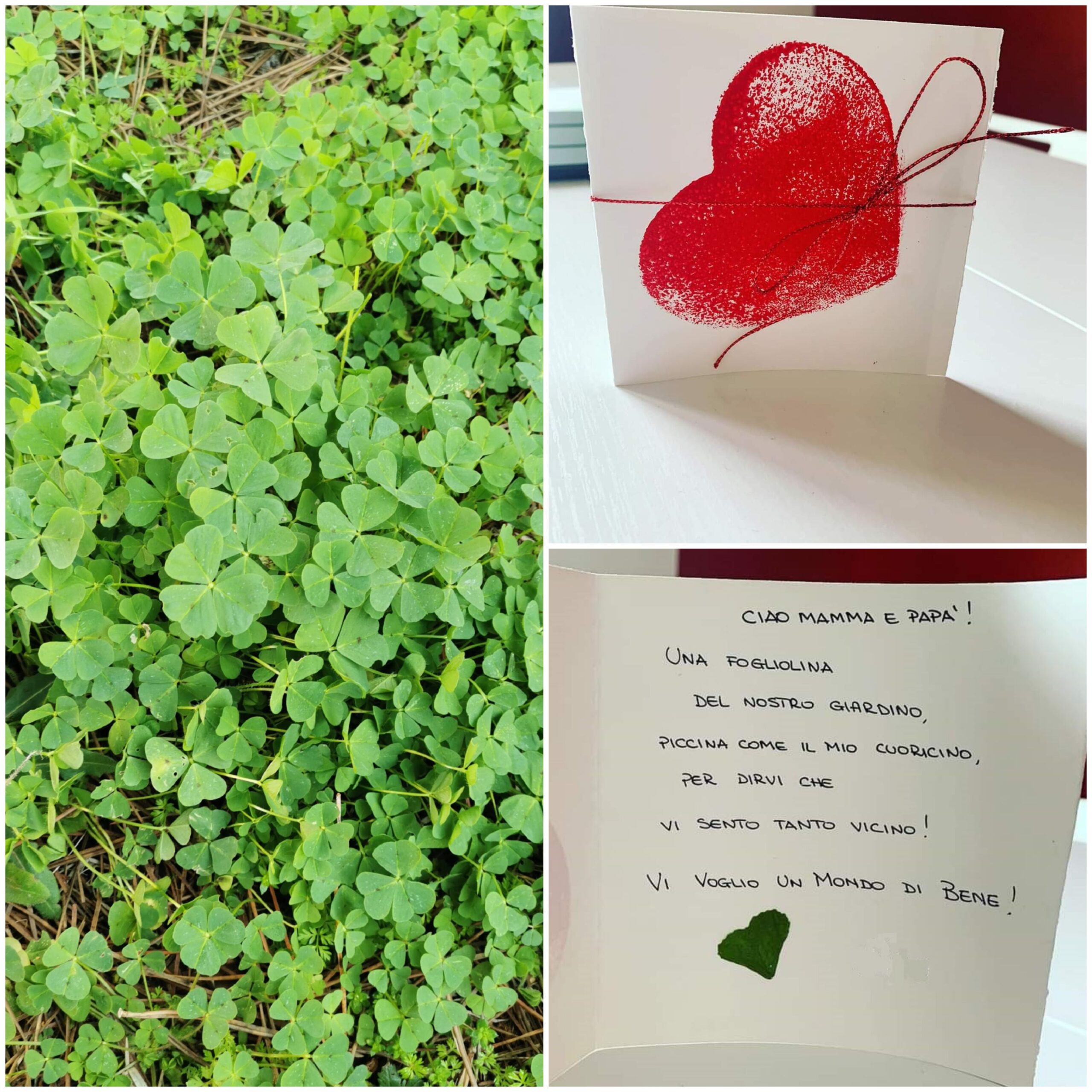 Nel frattempo i bambini hanno raccolto nel giardino del nido alcune tenere foglioline che ricordano un cuoricino e dopo aver giocato con una spugna, sagomata a forma di cuore, con la tempera ne hanno fatto una stampa per realizzare un piccolo “biglietto d’amore” per i loro genitori.