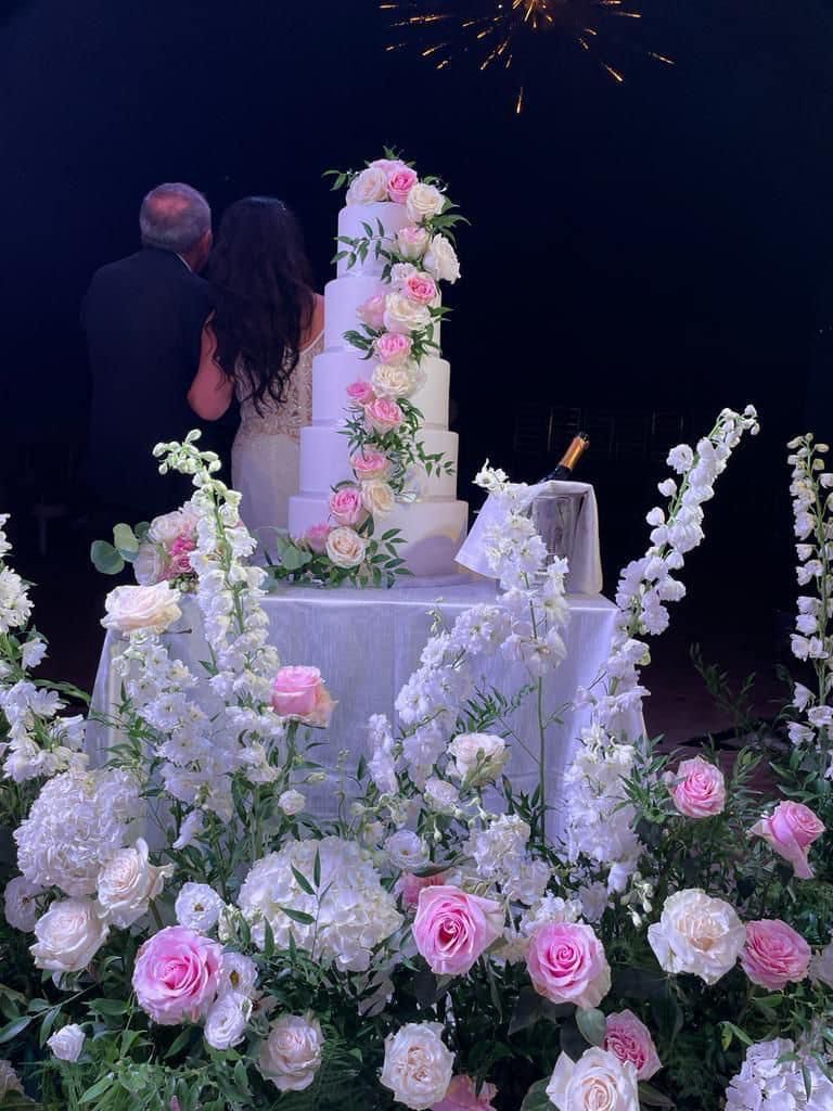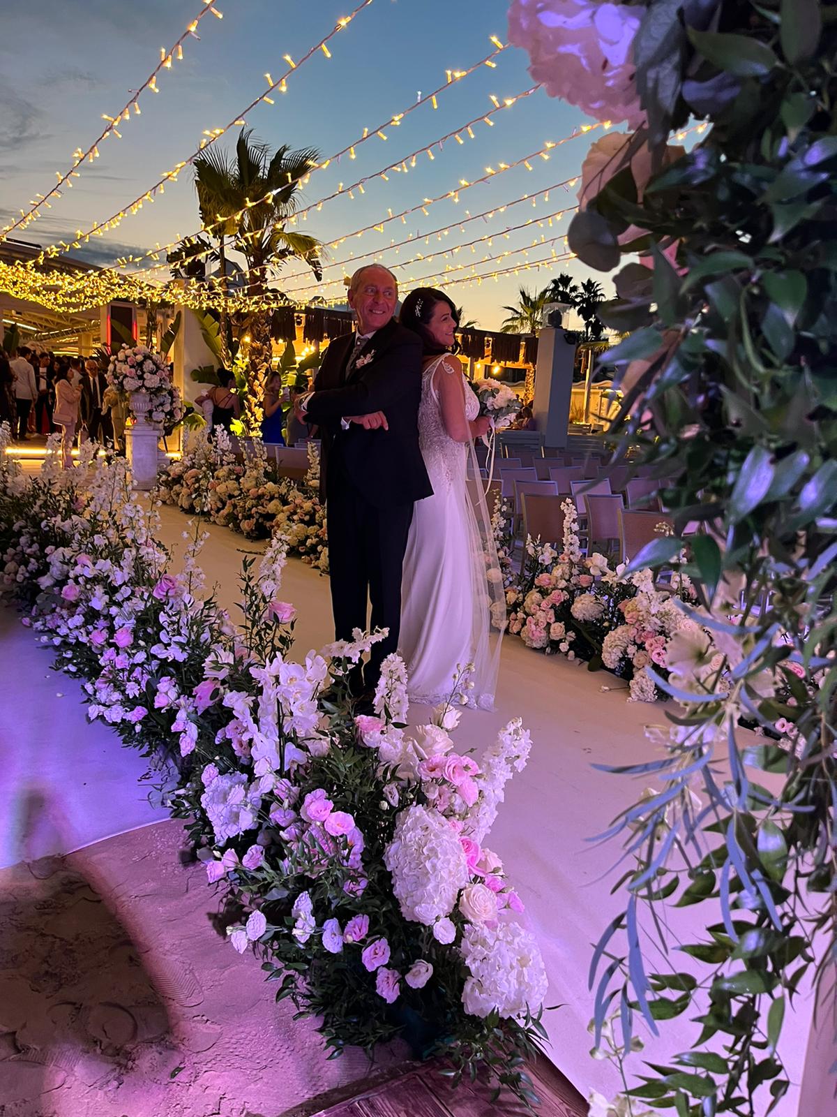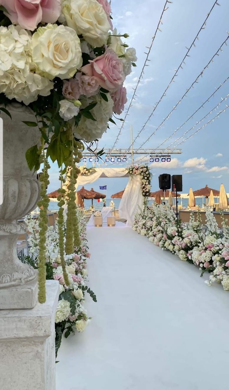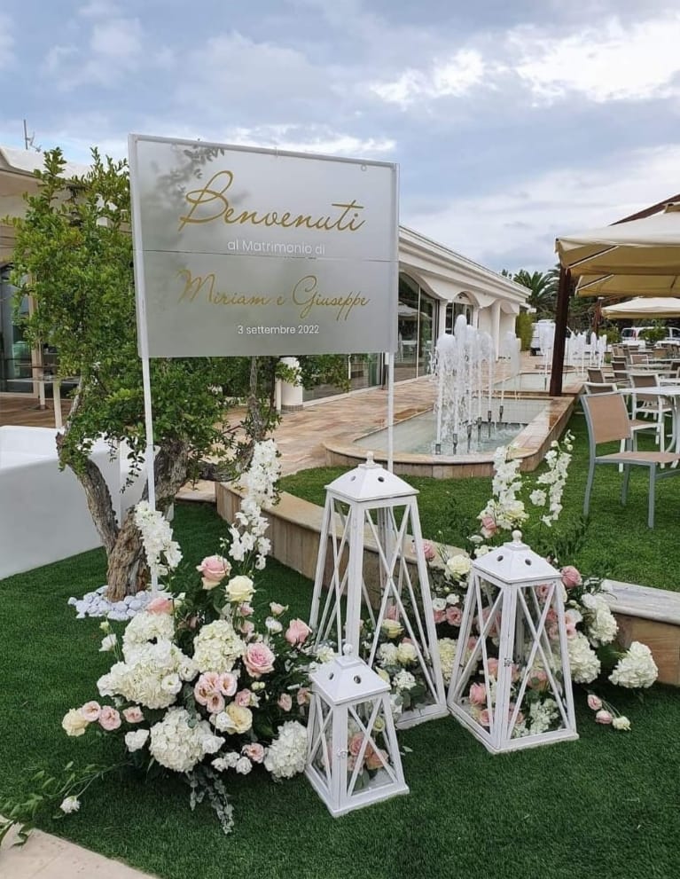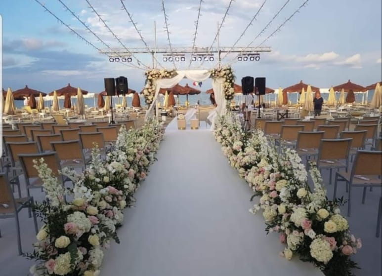 Sullo sfondo un calesse trainato da due cavalli bianchi e governato da un cocchiere in alta uniforme, tutta la location del Sayonara Beach addobbata da rose e fiori di particolare bellezza, panorami mozzafiato, che hanno fatto da contorno al fiabesco evento con fuochi d’artificio a coronamento della serata.