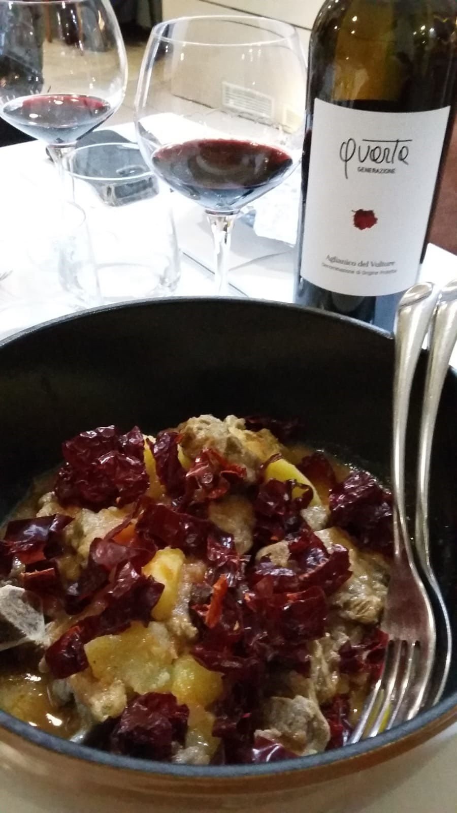 Arriva il momento della pecora nel coccio con peperoni cruschi di Senise e pane di Altamura a cui non si può non abbinare sua maestà L’AGLIANICO del Vulture Quarta Generazione di Giovanna Paternoster; fermentazione classica in acciaio a temperatura controllata per preservare la complessità aromatica poi una seconda fermentazione in botti aperte dove vino e bucce “si amano” per un anno!