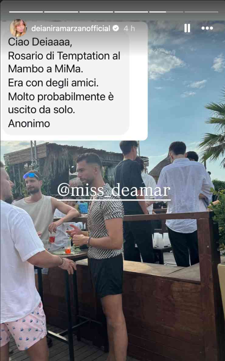 Nelle scorse ore, Deianira Marzano ha condiviso sul suo account social una segnalazione che vedrebbe Rosario completamente da solo, e quindi senza Lucia, in un locale milanese. Notando questo ‘dettaglio’, dunque, in molti hanno pensato che tra lui e la sua bella fidanzata sia finita dopo Temptation Island. In realtà, non si può dire nulla con certezza perché le notizie che si hanno in merito sono davvero pochissime.