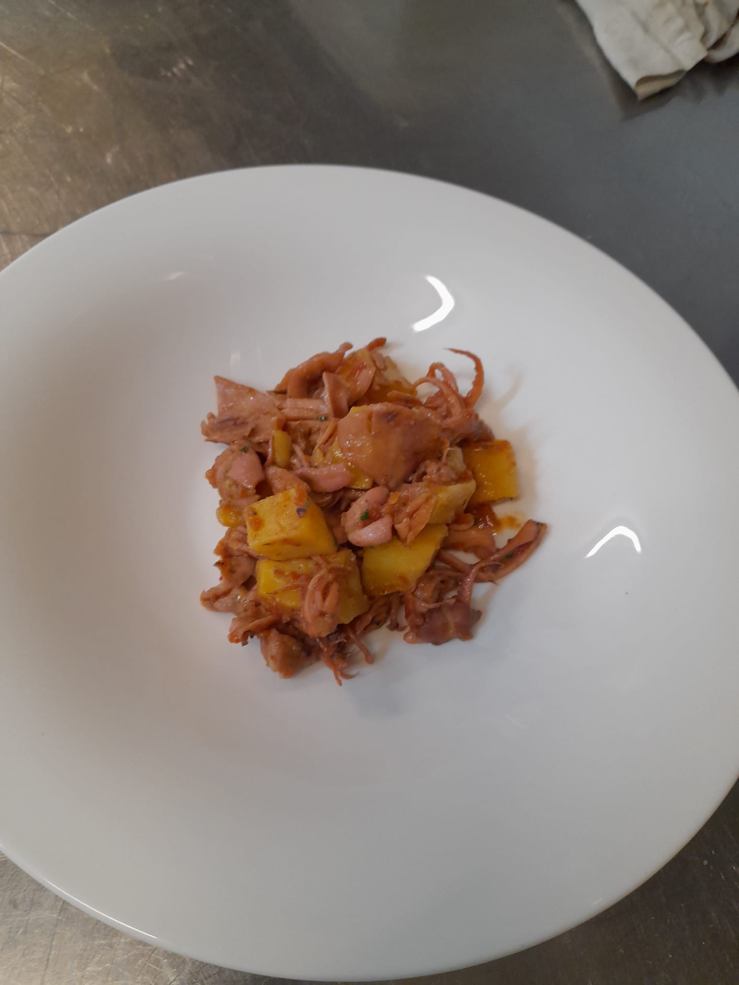 Si inizia con l’antipasto di fritto misto di pesce (con un’oliva fritta favolosa) e dei totani con patate morbidissimi a cui abbiniamo uno spumante metodo charmat di aglianico dell’azienda salernitana De Conciliis; il “Sèlim” (nome di un imperatore bizantino che occupò la zona nell’alto medioevo) è uno spumante prodotto con vino aglianico vinificato in bianco che esprime un lato finora inesplorato di questo antichissimo vitigno a bacca rossa famoso per essere l’anima di un grande vino rosso!
