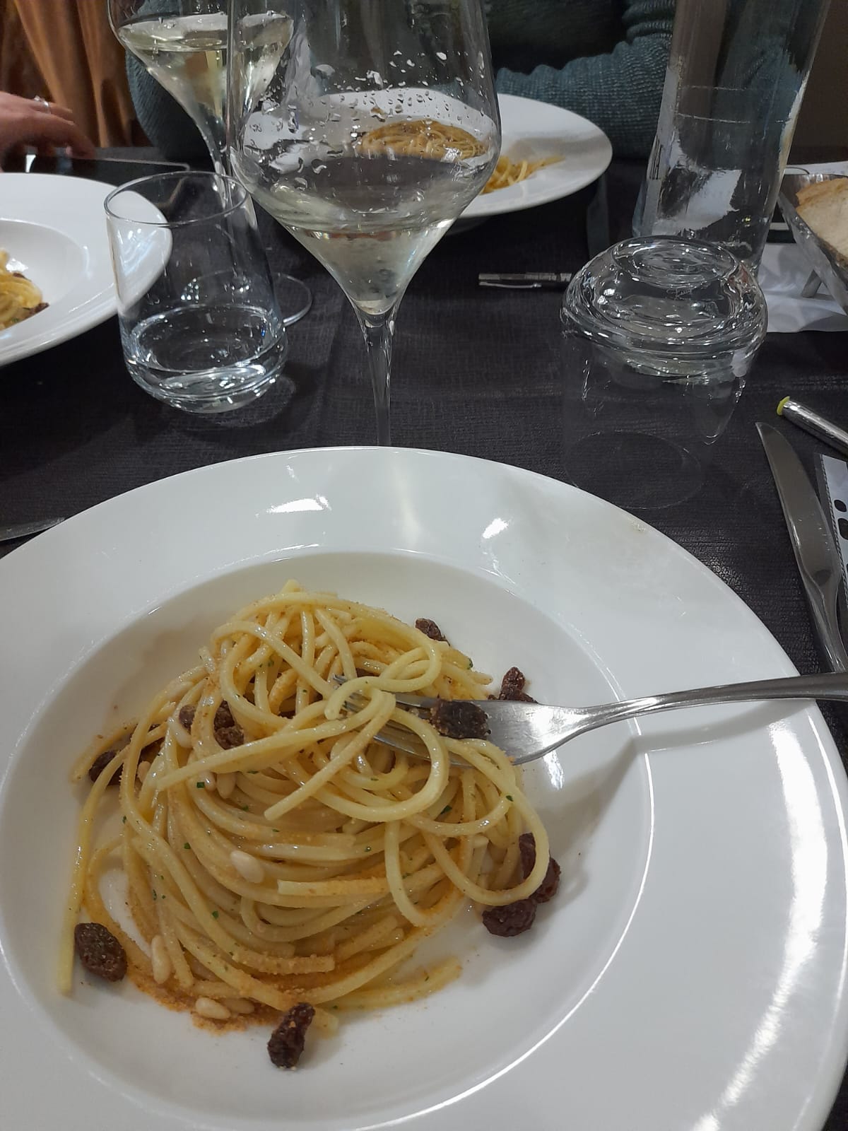 Arriva il primo piatto, gli spaghetti alla colatura di alici versione “Gualtiero Marchesi ” ben gradito da tutti i partecipanti a cui abbiniamo un vino bianco fermo di soli 12,5 gradi alcolici ma ricco di personalità in quanto frutto di un’uva a bacca rossa vinificata in bianco ovvero il “solito” aglianico (il nome deriva dall’antica polis Ellea ) prodotto da un’azienda nata nel 1878; Mastroberardino! il “NERO A META'” della storica casa vinicola con sede ad Atripalda (AV) è un vino fortemente voluto da Piero Mastroberardino (il figlio del grande don Antonio Mastroberardino colui che favorì lo sviluppo dell’enologia in campania già negli anni ’50) per dimostrare la valenza del vitigno.