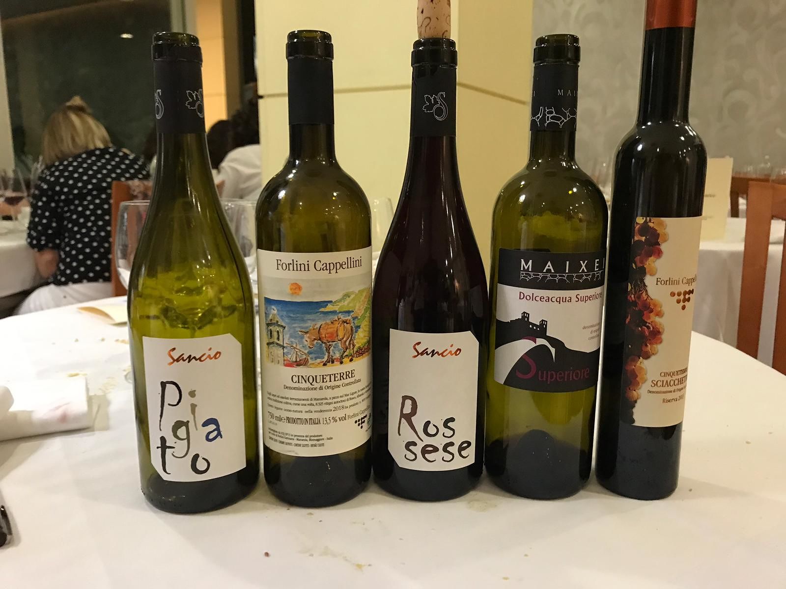 Gradimento vini: primo posto staccando nettamente gli altri per lo Sciacchetrà riserva Forlini-Cappellini con 11,74 punti segue il cinqueterre doc Forlini-Cappellini con 10,79 poi il Rossese di Sancio con 10,76 quindi il Dolceacqua di Maixei con 10,28 ed infine il Pigato di Sancio con 8,95.
