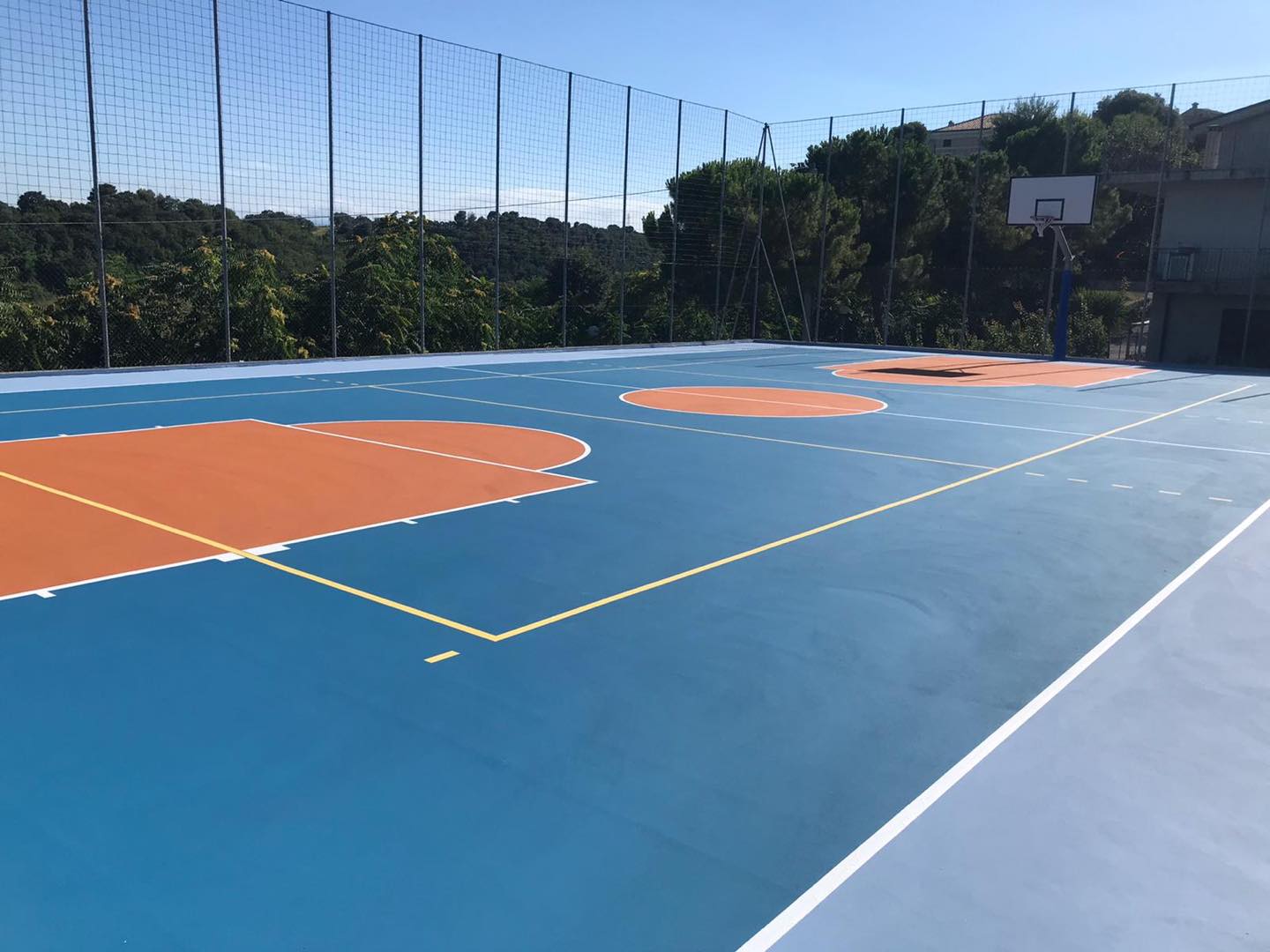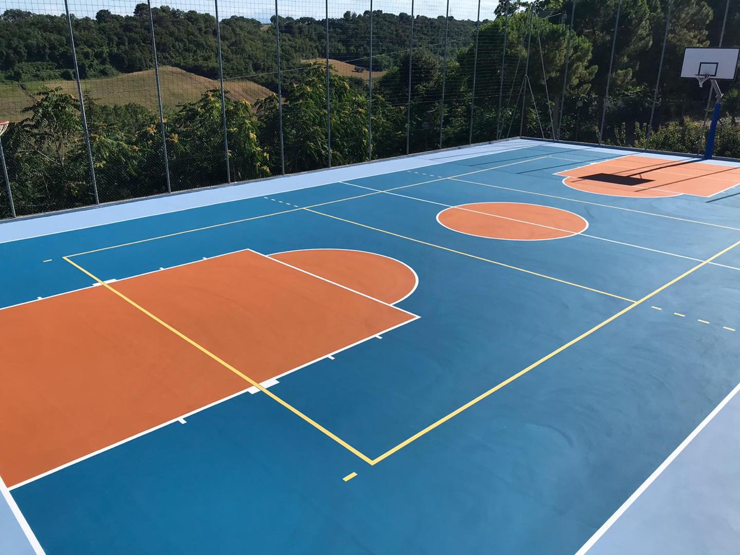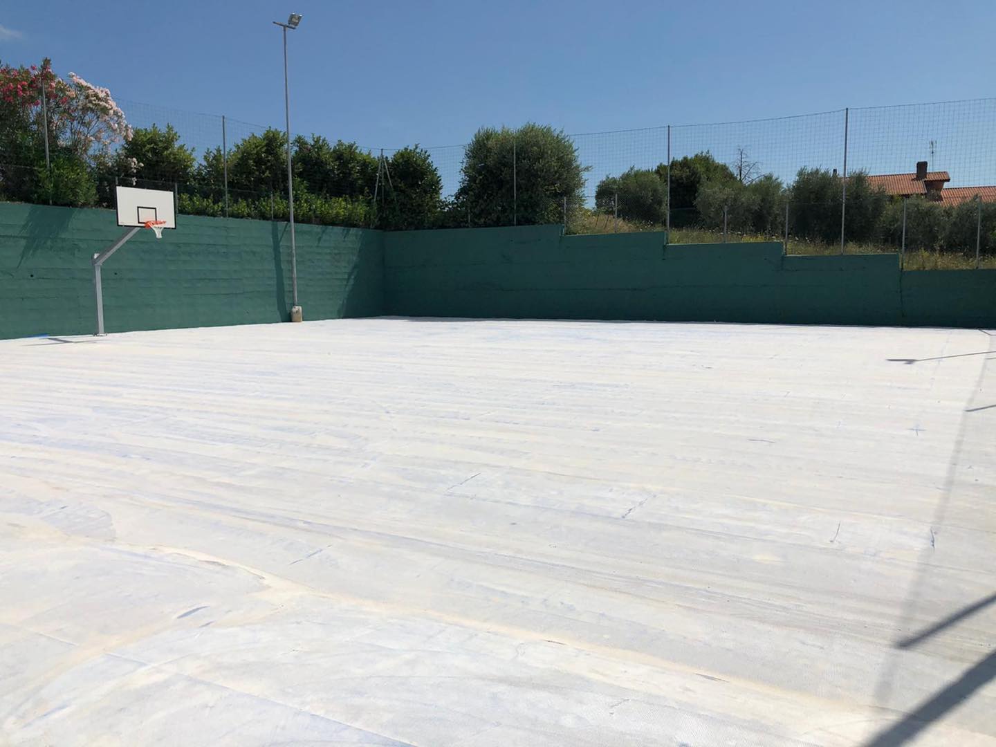 Il campo in resina sintetica è adatto sia per l’uso interno che per quello esterno ed è strutturato nel seguente modo: pavimentazione sintetica impermeabile (con colori a scelta del cliente) distesa in più strati su sottofondo in tappetino bituminoso, è composto da resine acriliche e inerti quarziferi e non necessita di una manutenzione giornaliera. Questa superficie è stata studiata per fornire lunga durata, un buon comfort e una alta qualità di gioco. Un grande valore aggiunto di questa tipologia di campo è la polivalenza: infatti si può predisporre la superficie di gioco anche per atri sport quali pallavolo, basket e calcetto oltre alle piste ciclabili e piste di pattinaggio.