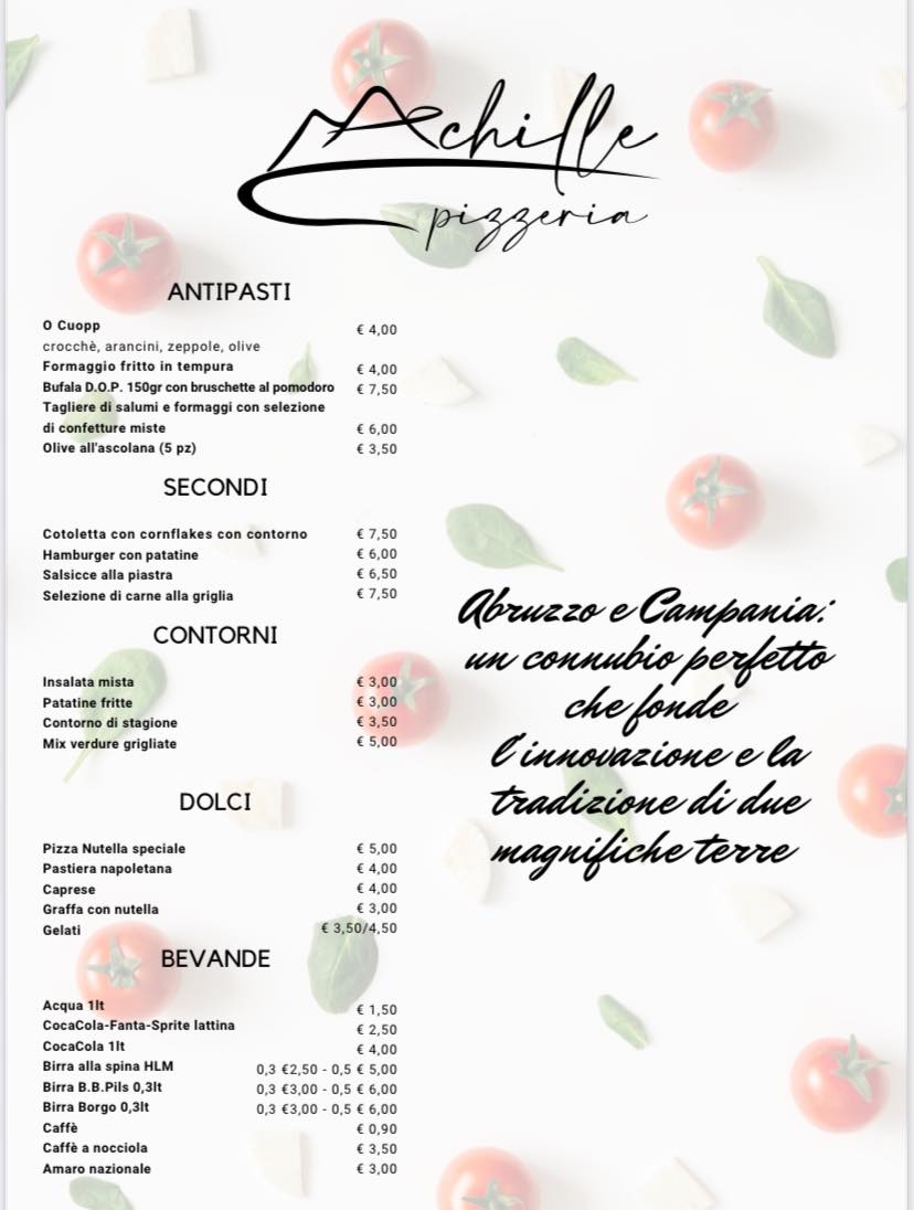 Ciliegina sulla torta della Pizzeria Achille è la preparazione della PIZZA, in tutte le sue varianti, creata con ingredienti semplici, di qualità e che tengano fede alla tradizione.