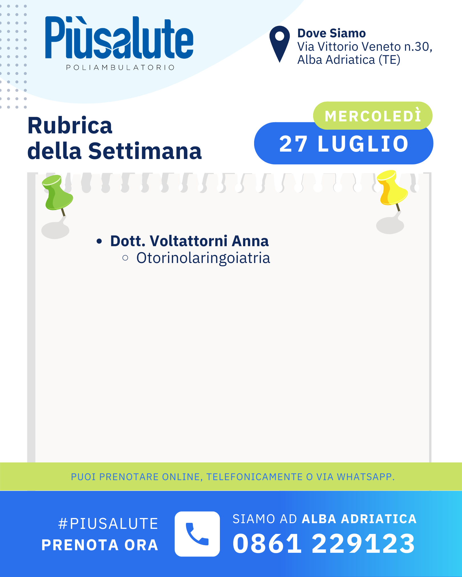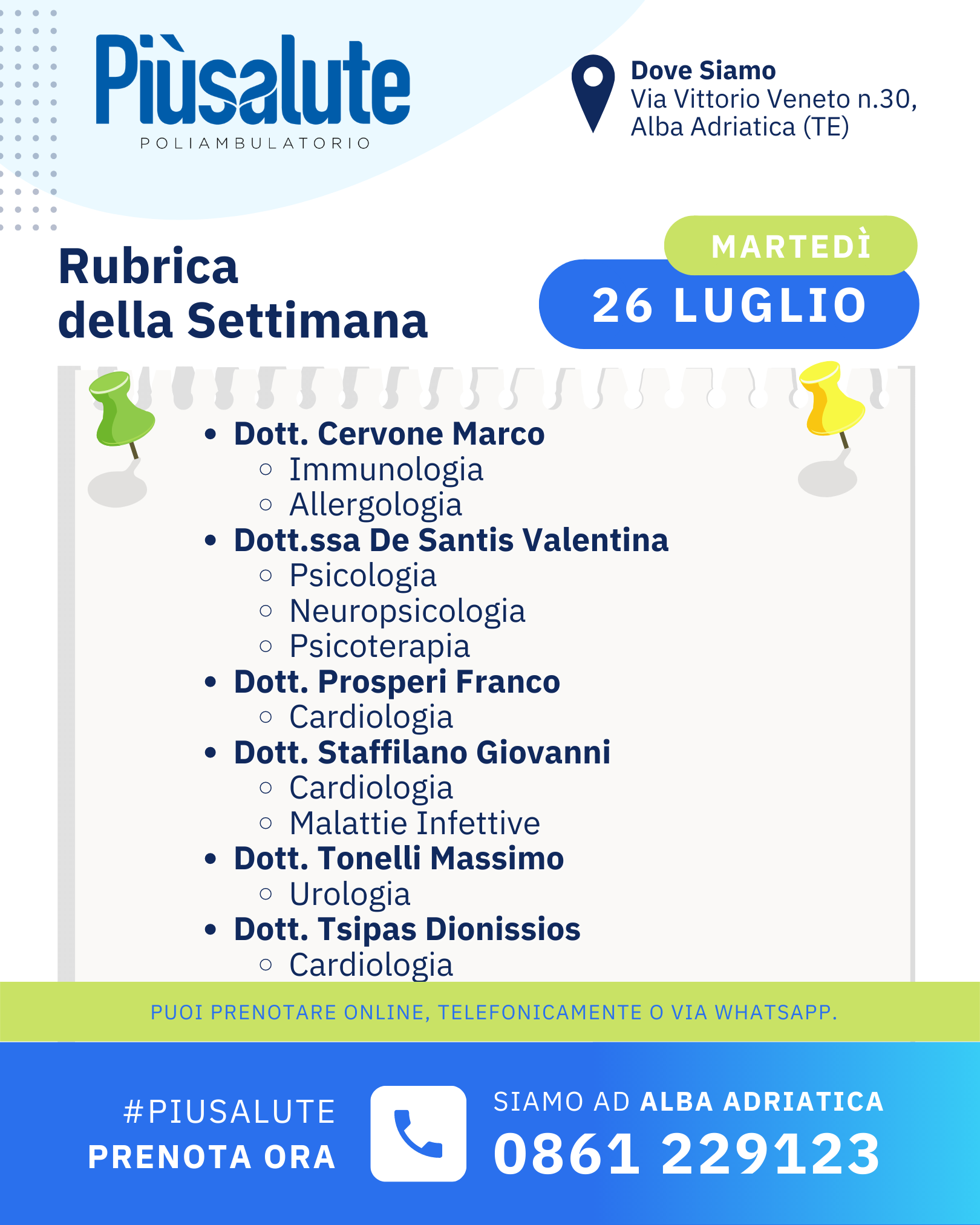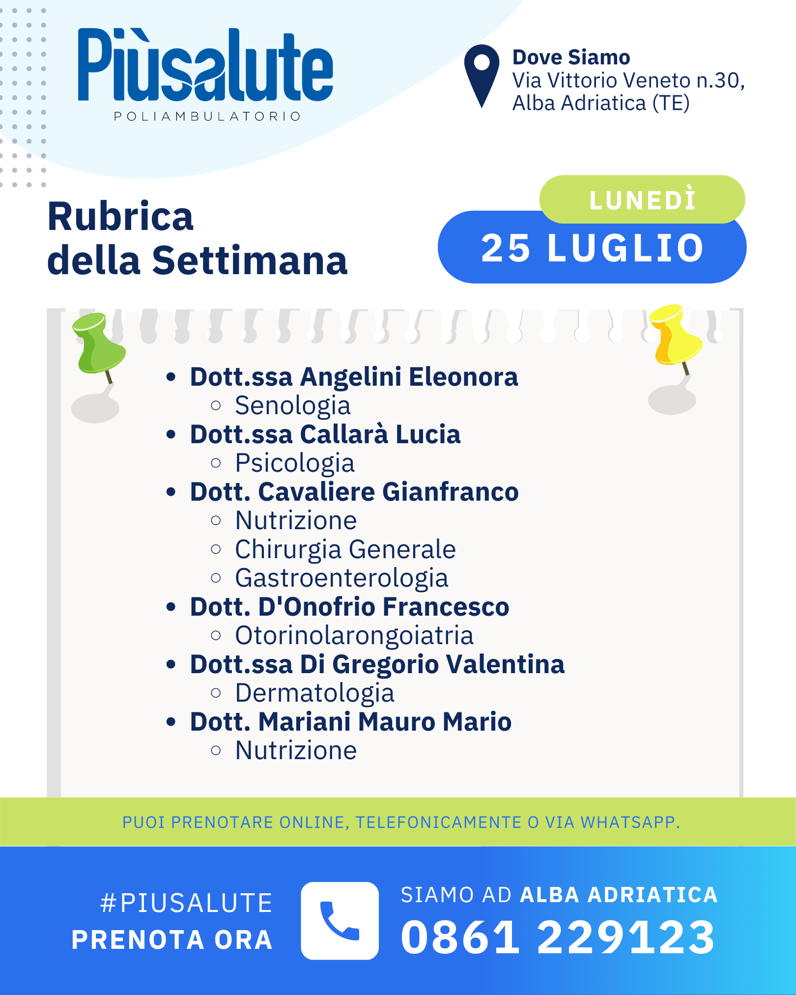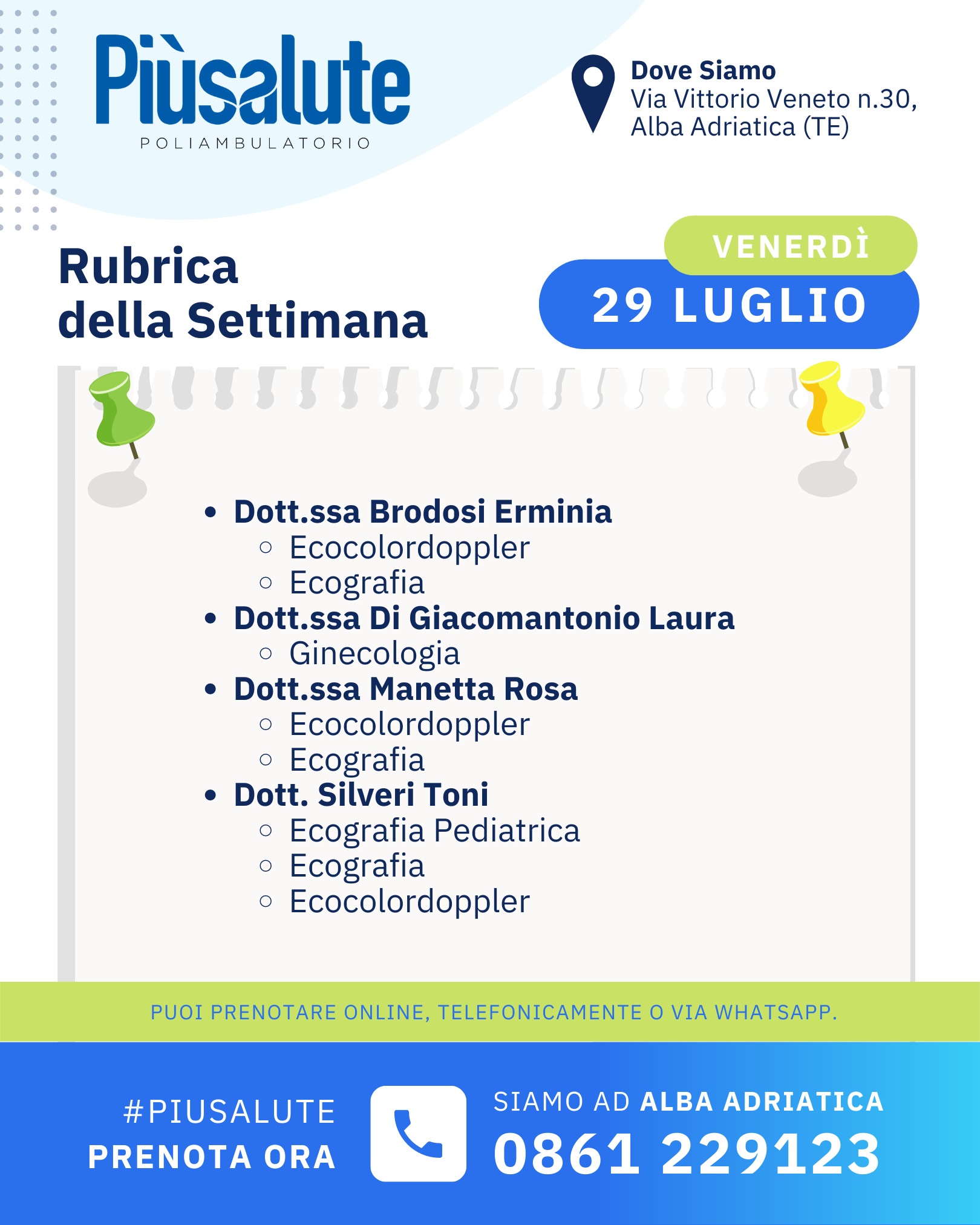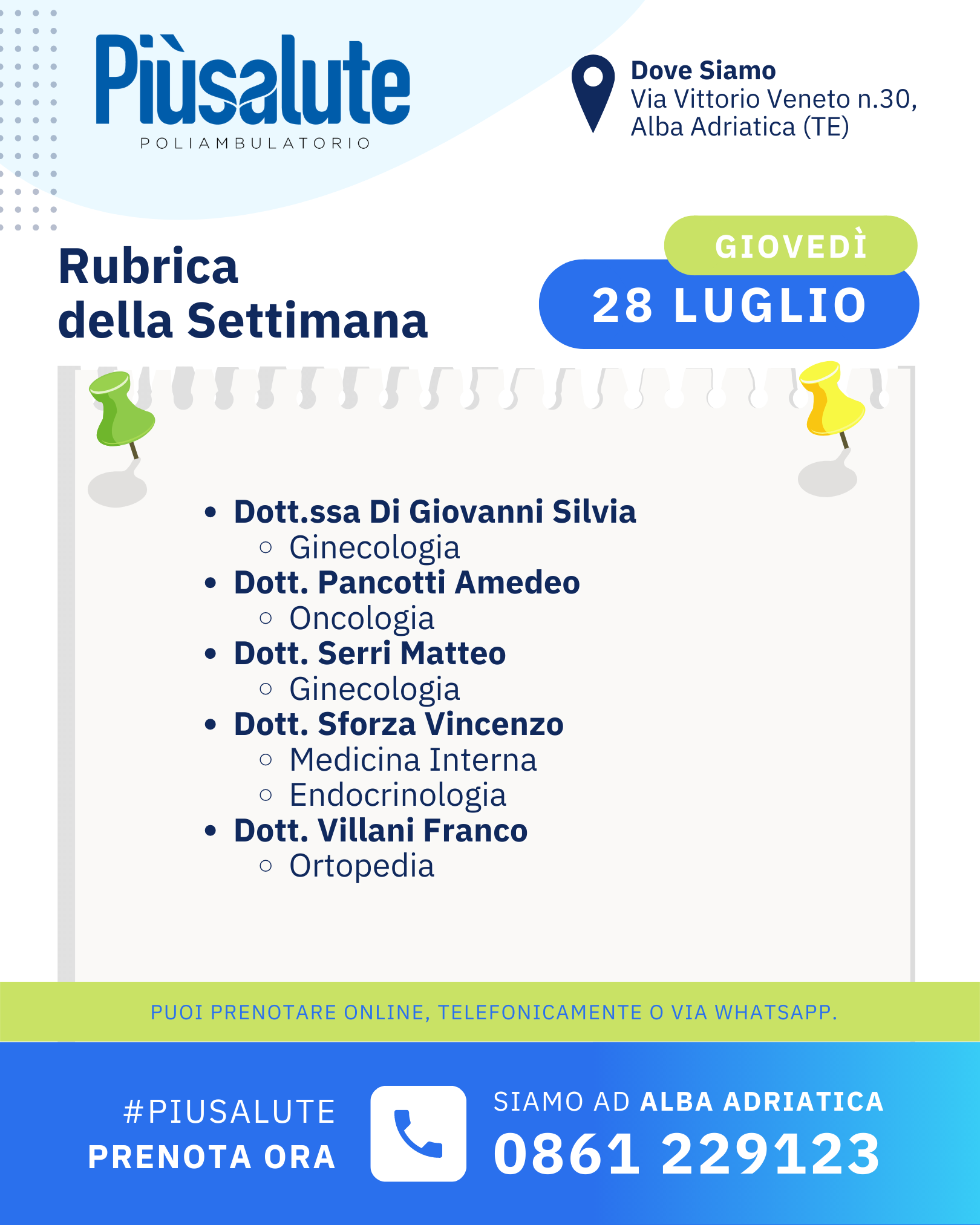 LE VISITE SETTIMANALI fino al 29 LUGLIO presso il Poliambulatorio Più Salute ad Alba Adriatica