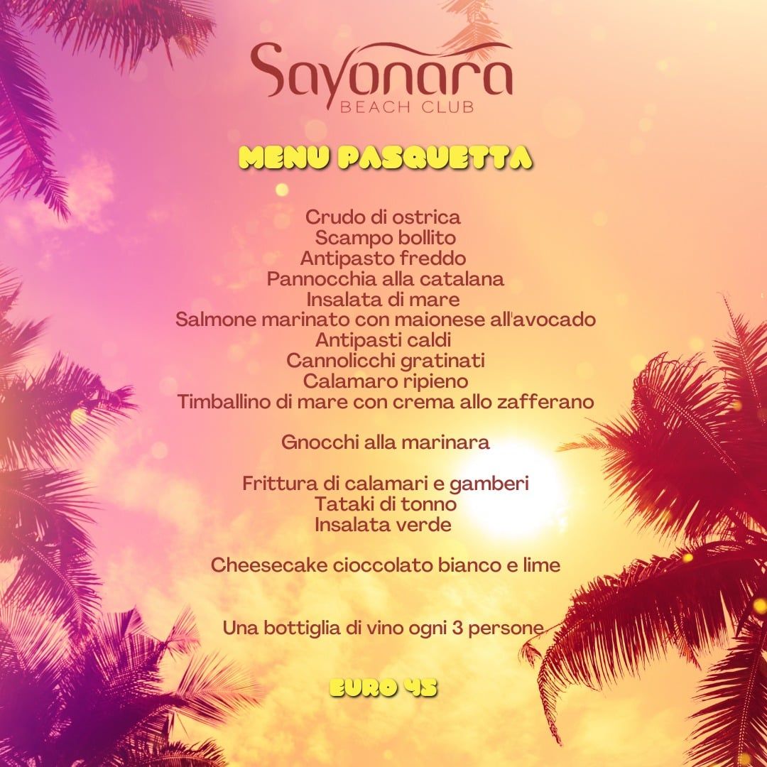Nuova gestione Sayonara, un ristorante nuovo per pranzare e cenare sul lungomare di Tortoreto. Inaugurato il 9 aprile con una nuova gestione, è pronto ad offrire un menù di Pasqua di qualità, con prodotti estremamente prelibati. Un menù ricercato e gustoso, in una location affascinante!