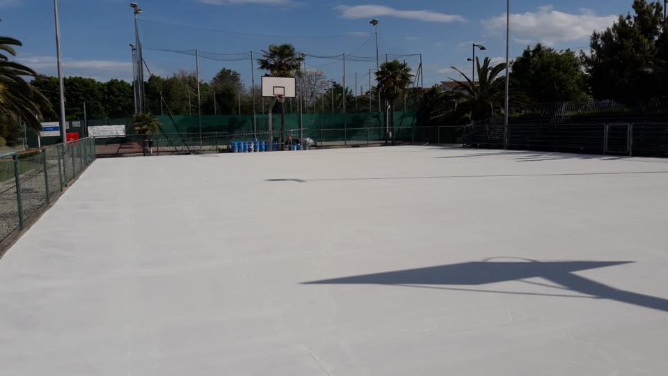 Il campo in resina sintetica è adatto sia per l’uso interno che per quello esterno ed è strutturato nel seguente modo: pavimentazione sintetica impermeabile (con colori a scelta del cliente) distesa in più strati su sottofondo in tappetino bituminoso, è composto da resine acriliche e inerti quarziferi e non necessita di una manutenzione giornaliera. Questa superficie è stata studiata per fornire lunga durata, un buon comfort e una alta qualità di gioco. Un grande valore aggiunto di questa tipologia di campo è la polivalenza: infatti si può predisporre la superficie di gioco anche per atri sport quali pallavolo, basket e calcetto oltre alle piste ciclabili e piste di pattinaggio