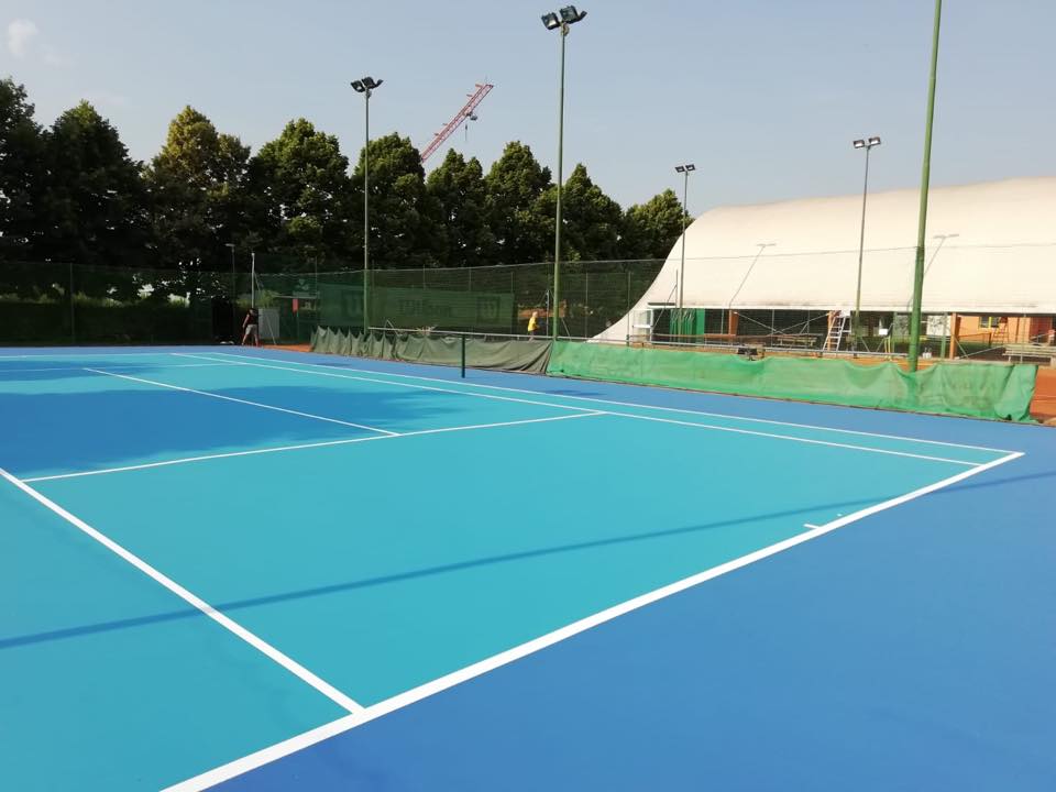 Il campo in resina sintetica è adatto sia per l’uso interno che per quello esterno ed è strutturato nel seguente modo: pavimentazione sintetica impermeabile (con colori a scelta del cliente) distesa in più strati su sottofondo in tappetino bituminoso, è composto da resine acriliche e inerti quarziferi e non necessita di una manutenzione giornaliera. Questa superficie è stata studiata per fornire lunga durata, un buon comfort e una alta qualità di gioco. Un grande valore aggiunto di questa tipologia di campo è la polivalenza: infatti si può predisporre la superficie di gioco anche per atri sport quali pallavolo, basket e calcetto oltre alle piste ciclabili e piste di pattinaggio.