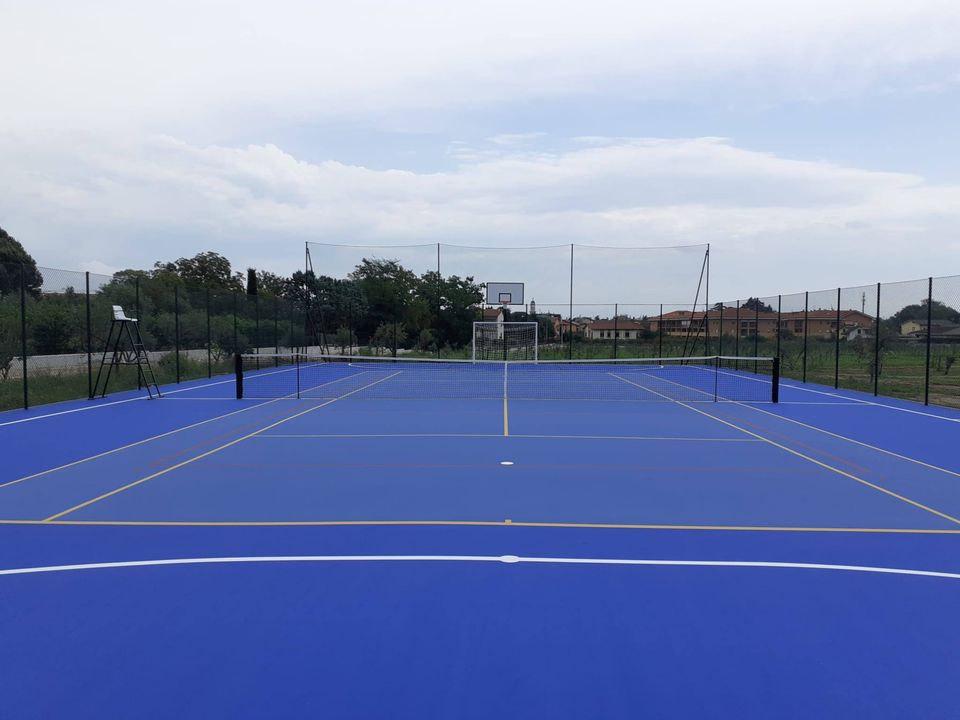 Il campo in resina sintetica è adatto sia per l’uso interno che per quello esterno ed è strutturato nel seguente modo: pavimentazione sintetica impermeabile (con colori a scelta del cliente) distesa in più strati su sottofondo in tappetino bituminoso, è composto da resine acriliche e inerti quarziferi e non necessita di una manutenzione giornaliera. Questa superficie è stata studiata per fornire lunga durata, un buon comfort e una alta qualità di gioco. Un grande valore aggiunto di questa tipologia di campo è la polivalenza: infatti si può predisporre la superficie di gioco anche per atri sport quali pallavolo, basket e calcetto oltre alle piste ciclabili e piste di pattinaggio.