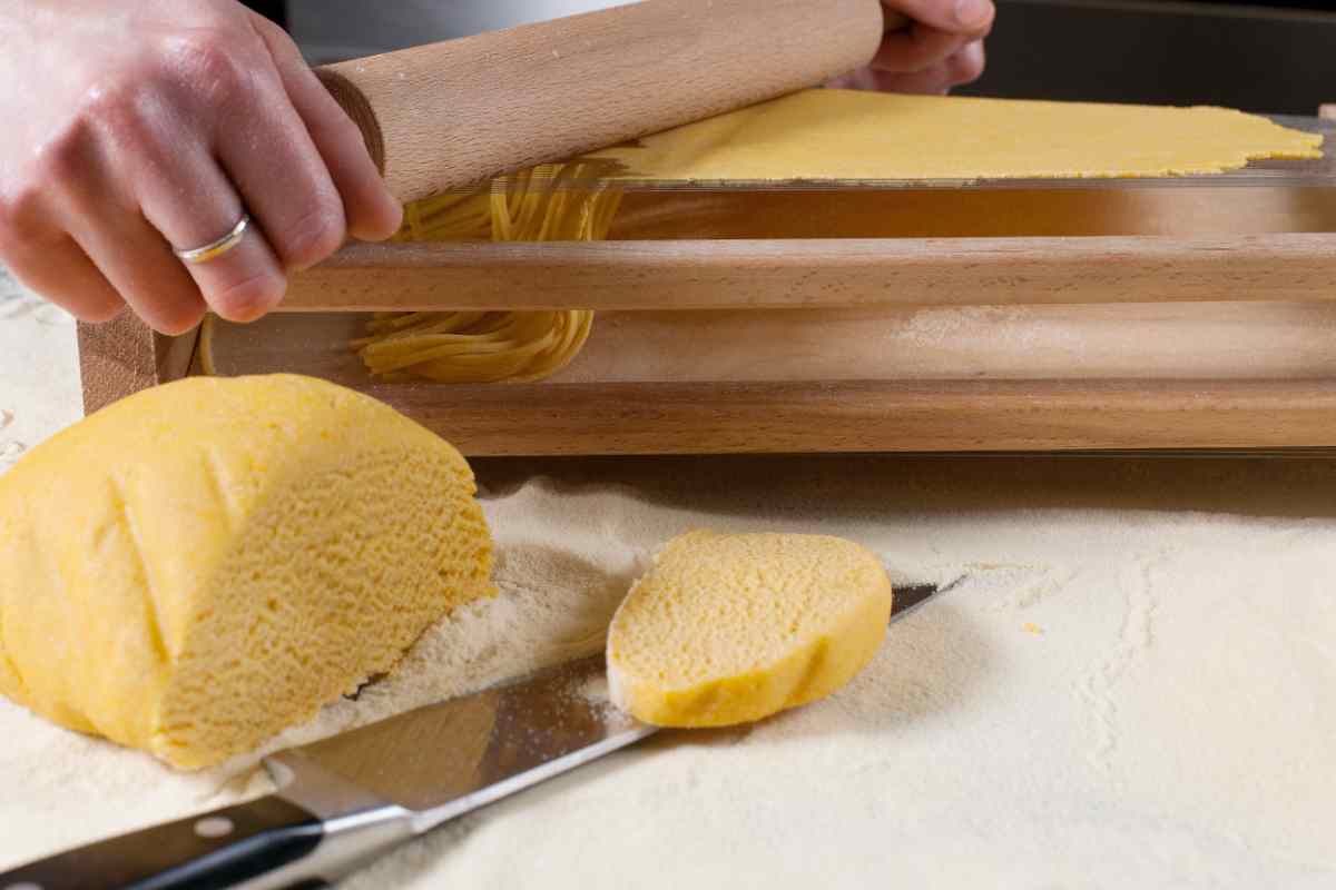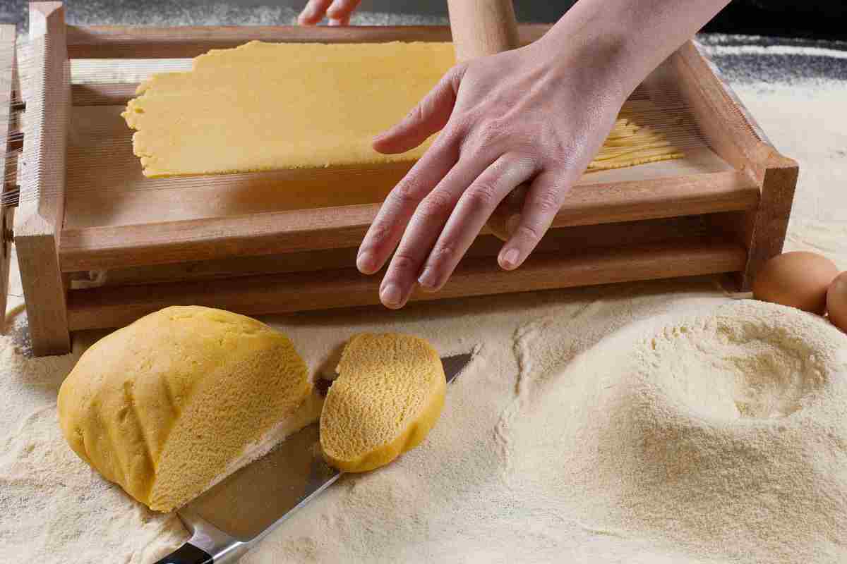 mani su mattarello che pressa l'impasto per formare gli spaghetti alla chitarra