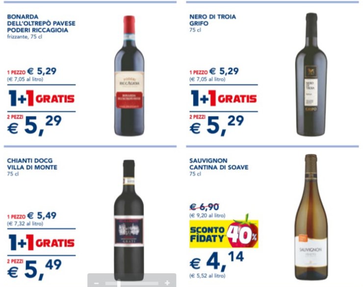 Sempre a 5,29 euro possiamo stupire tutti con un bel Nero di Troia: un vino che non ha bisogno di presentazioni e che si accosta benissimo a pietanze dai sapori vivaci. Anche qui: prendiamo due bottiglie e ne paghiamo una sola. Con 5,49 euro, invece, ci accaparriamo due bottiglie di Chianti DOCG Villa Di Monte: ottimo per un secondo robusto di carne.