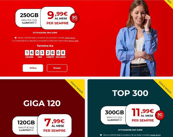 La TOP 250 prevede minuti e sms illimitati verso numeri fissi e mobili, accesso alla rete 5G, 250 giga di traffico dati ogni mese e 13 giga di traffico dati in roaming qualora si andasse all’estero ad un costo di 9,99 euro al mese. La TOP 300 prevede anch’essa sms e minuti illimitati, con 300 giga di traffico in Italia e 16 giga in roaming ad un costo mensile di 11,99 euro.