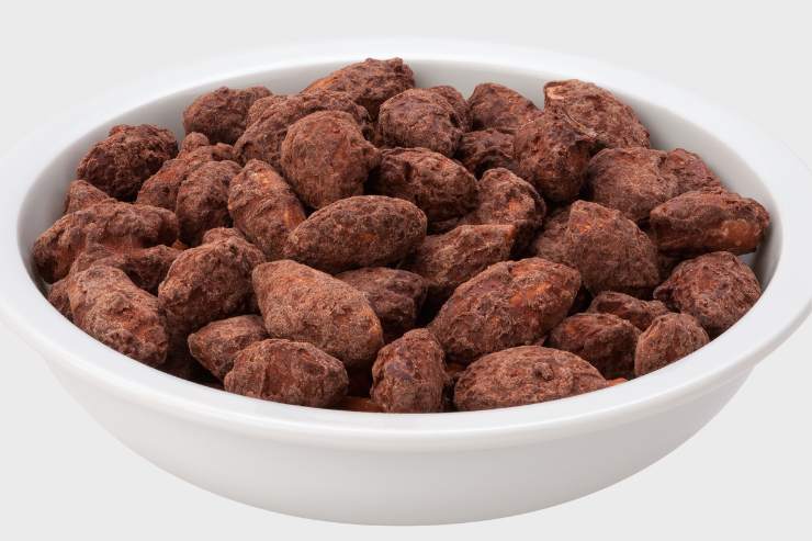 - Quando le mandorle saranno accagliate, rovesciarle all’interno di una teglia con carta da forno, separarla le una della altre e distanziarle tra di loro spolverandole con del cacao amaro. Rimescolare con le mani così da far distribuire il cacao per bene.