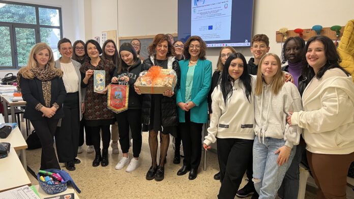 Nereto. La Dirigente Scolastica dell’IIS “Peano-Rosa” di Nereto, Nadia Di Gaspare, ha ricevuto gli omaggi dell’amministrazione comunale di Nereto, consegnati dalla consigliera Nicolina Elia e destinati alle autorità francesi che, fino al 25 marzo 2023, nel Lycée Victor Hugo, accoglieranno studenti e docenti dell’Istituto a Château-Gontier sur Mayenne, regione dei Paesi della Loira.