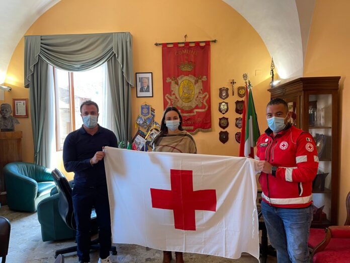 Giulianova. E’ stata consegnata oggi, 5 maggio, nelle mani del sindaco Jwan Costantini e del vice Lidia Albani, la bandiera della Croce Rossa, già posizionata su uno dei tre pennoni del palazzo comunale di corso Garibaldi dove continuerà a sventolare sino al 9 maggio prossimo.