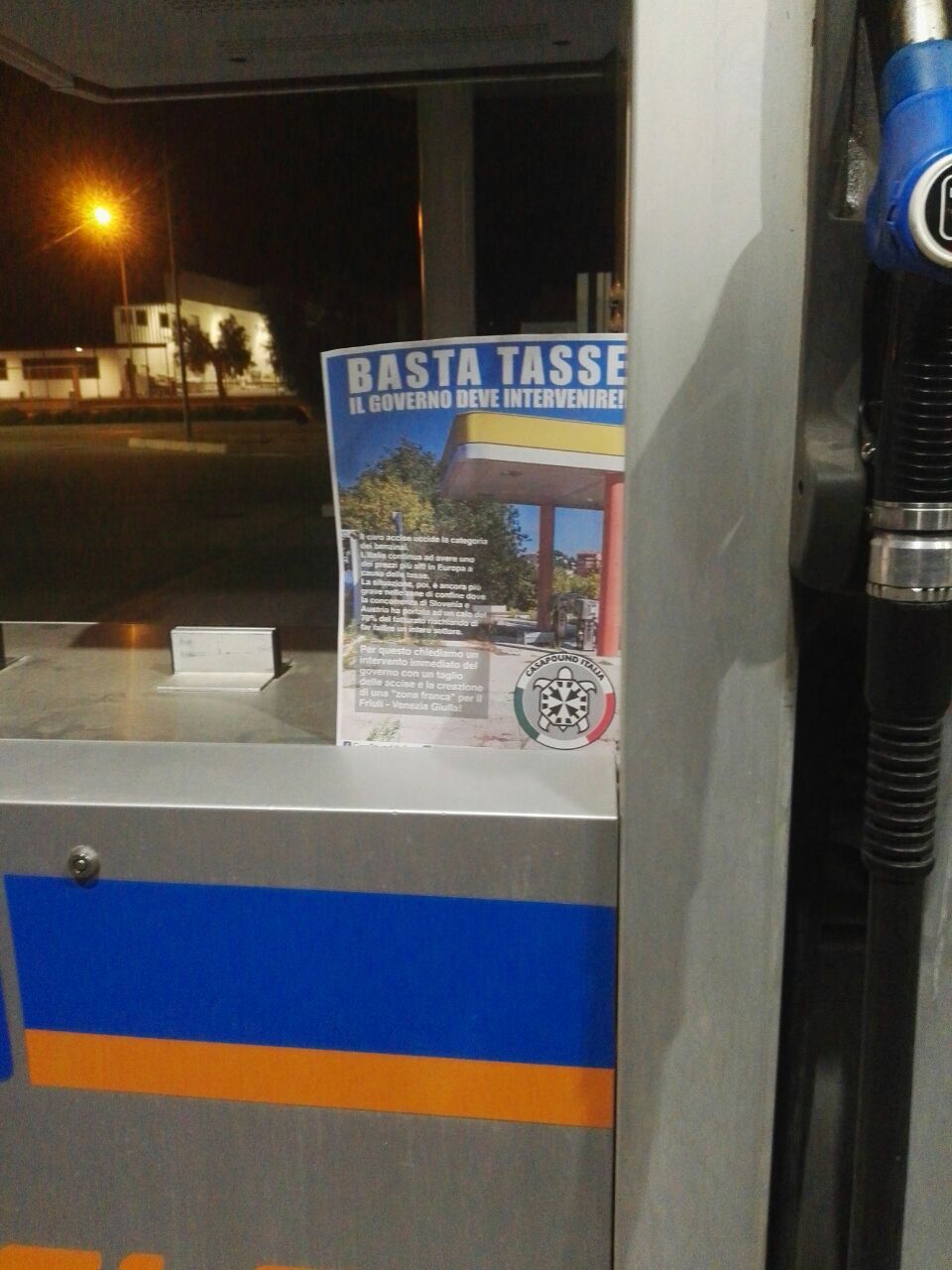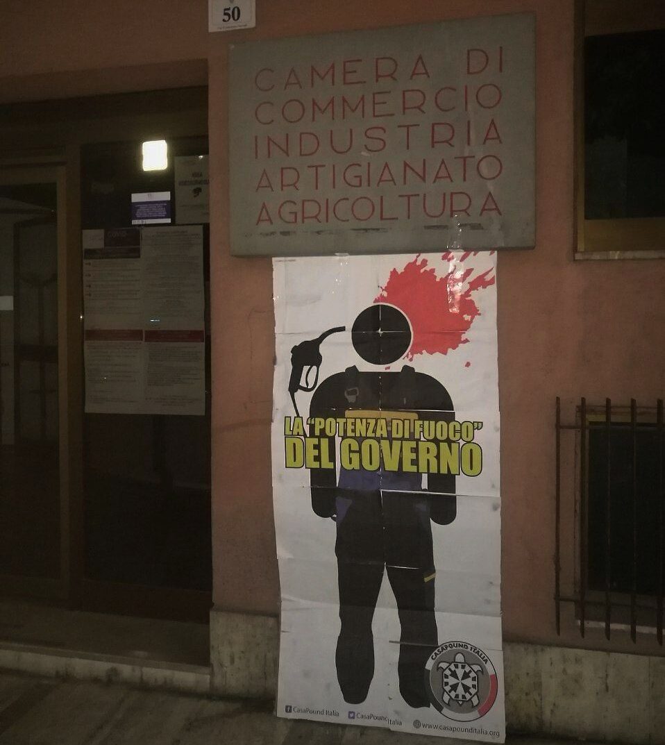Teramo. Volantini di solidarietà presso i distributori di benzina della Val Vibrata e cartonato a grandezza d’uomo davanti alla Camera di Commercio di Teramo per denunciare la crisi in cui versa la categoria dei benzinai e stigmatizzare l’inerzia del Governo: l’azione compiuta da CasaPound in tutta Italia, questa notte è arrivata anche nel teramano.