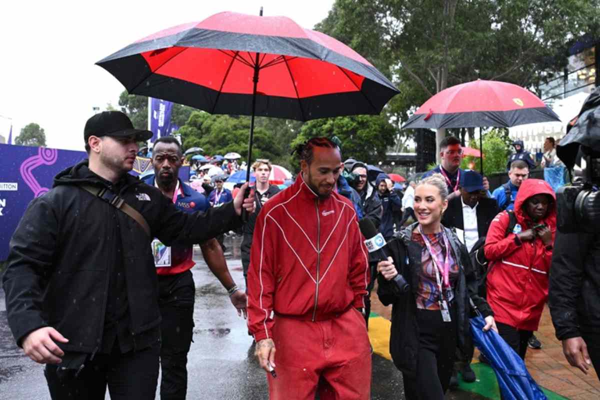 Lewis Hamilton cammina sotto ombrello